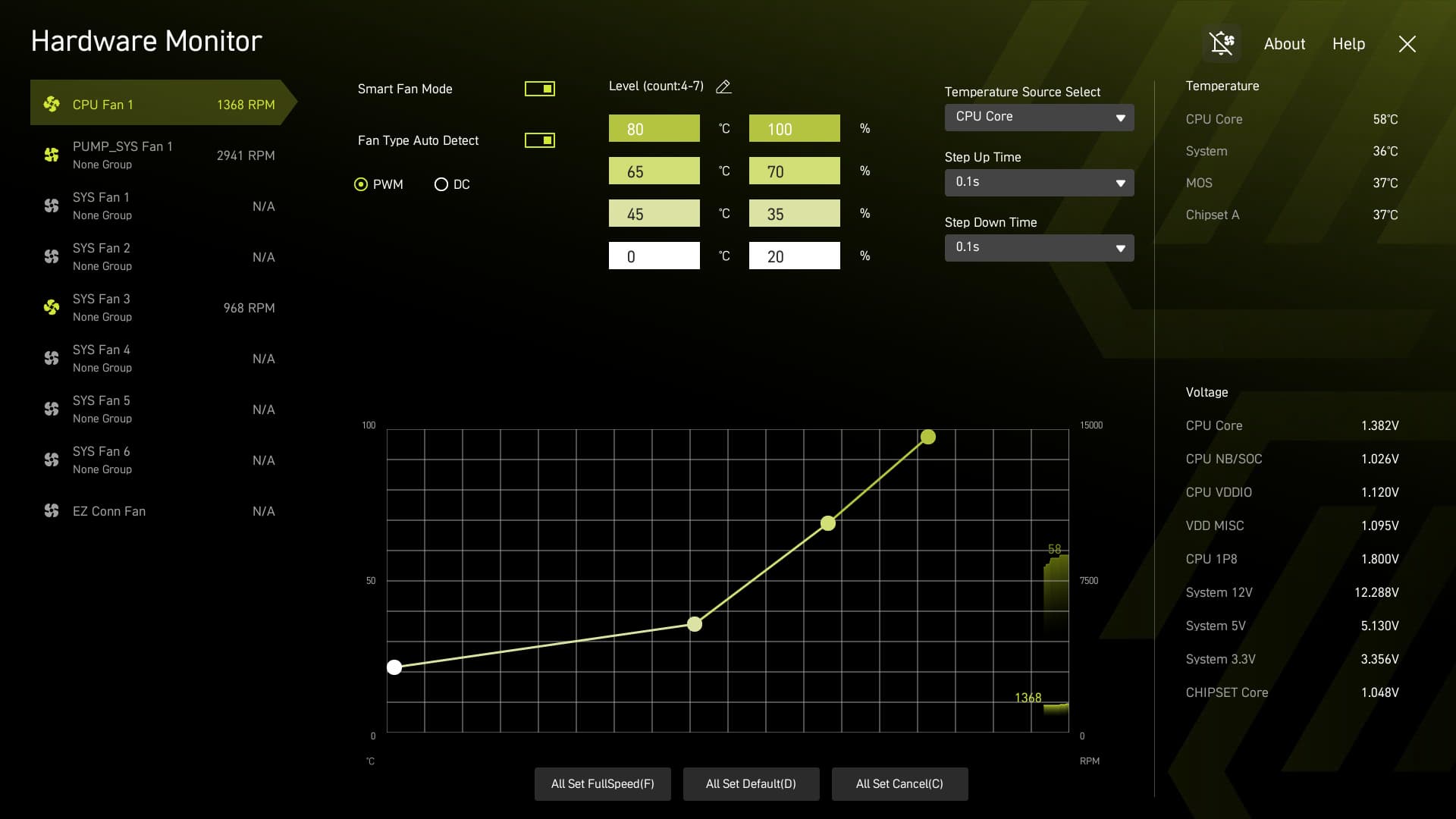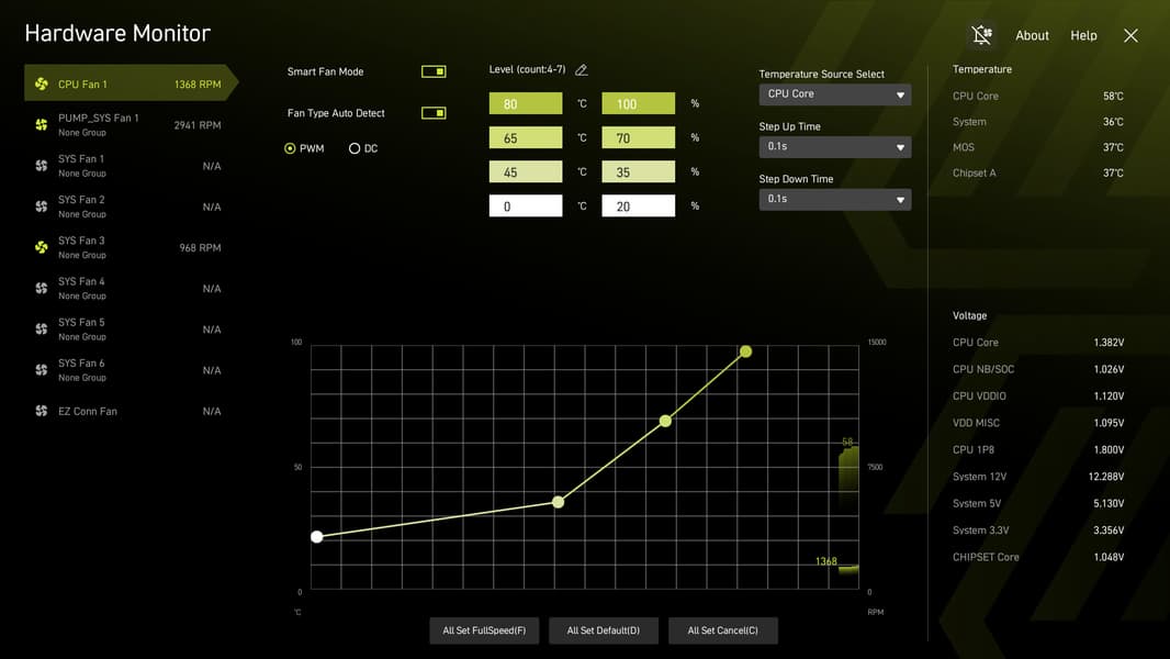 Мониторинг и опции загрузочного меню — всем хорошо известны. Там же есть утилита по настройке работы гнезд для вентиляторов.