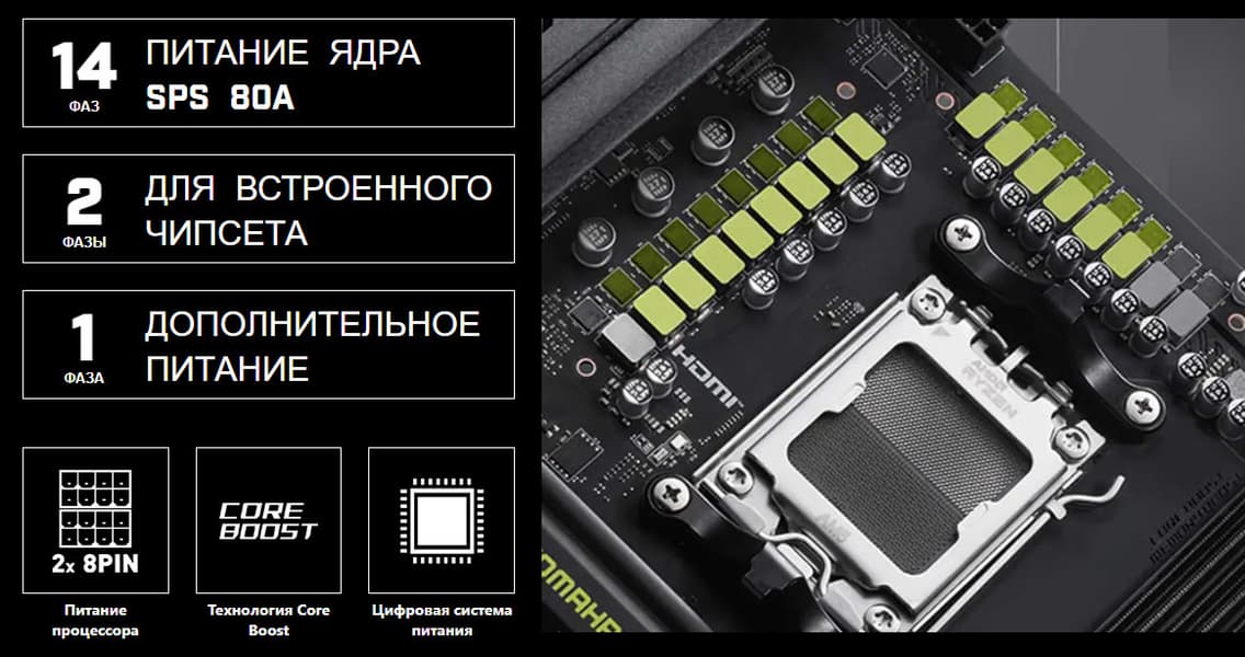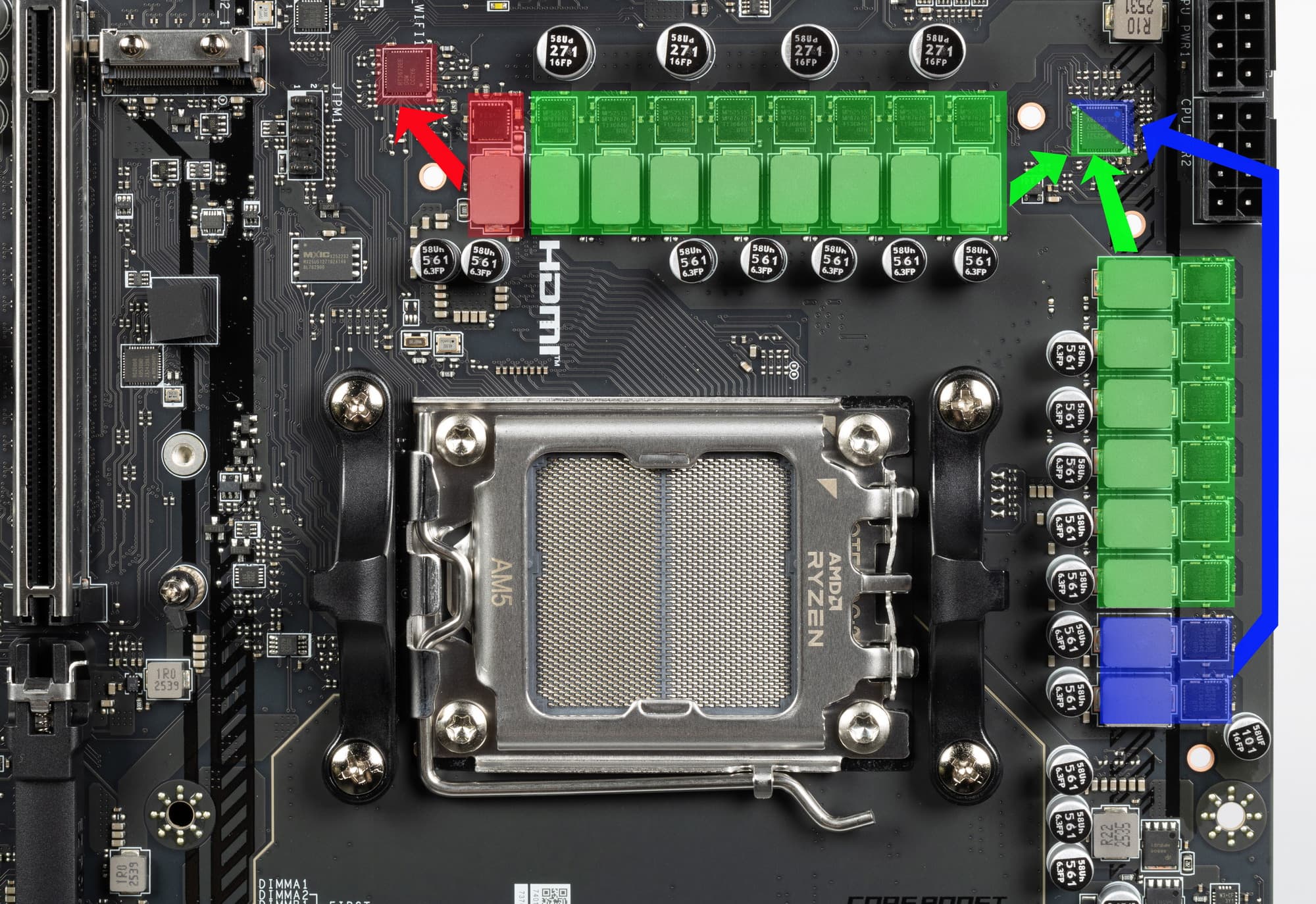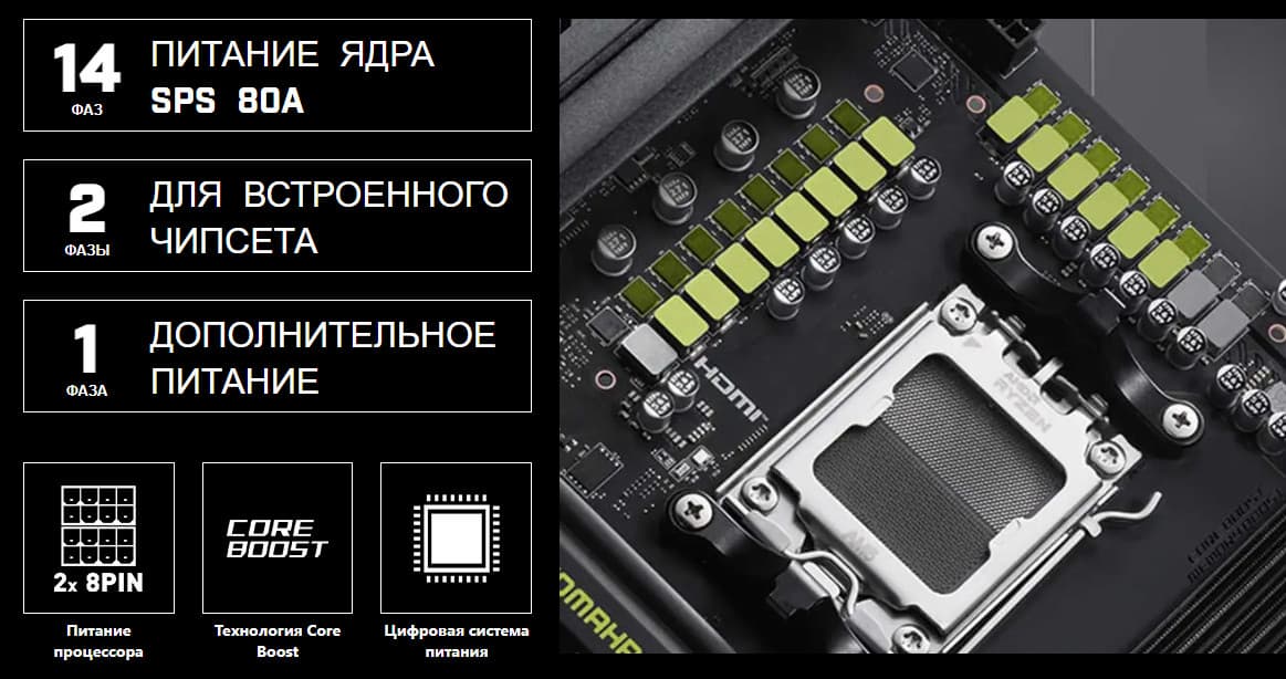 Внешне схема питания выглядит как 14+2+1: 14 фаз — ядро процессора, 2 фазы — SoC (I/O-чиплет Ryzen), 1 фаза — VDD_MISC (вывод встроенной графики).