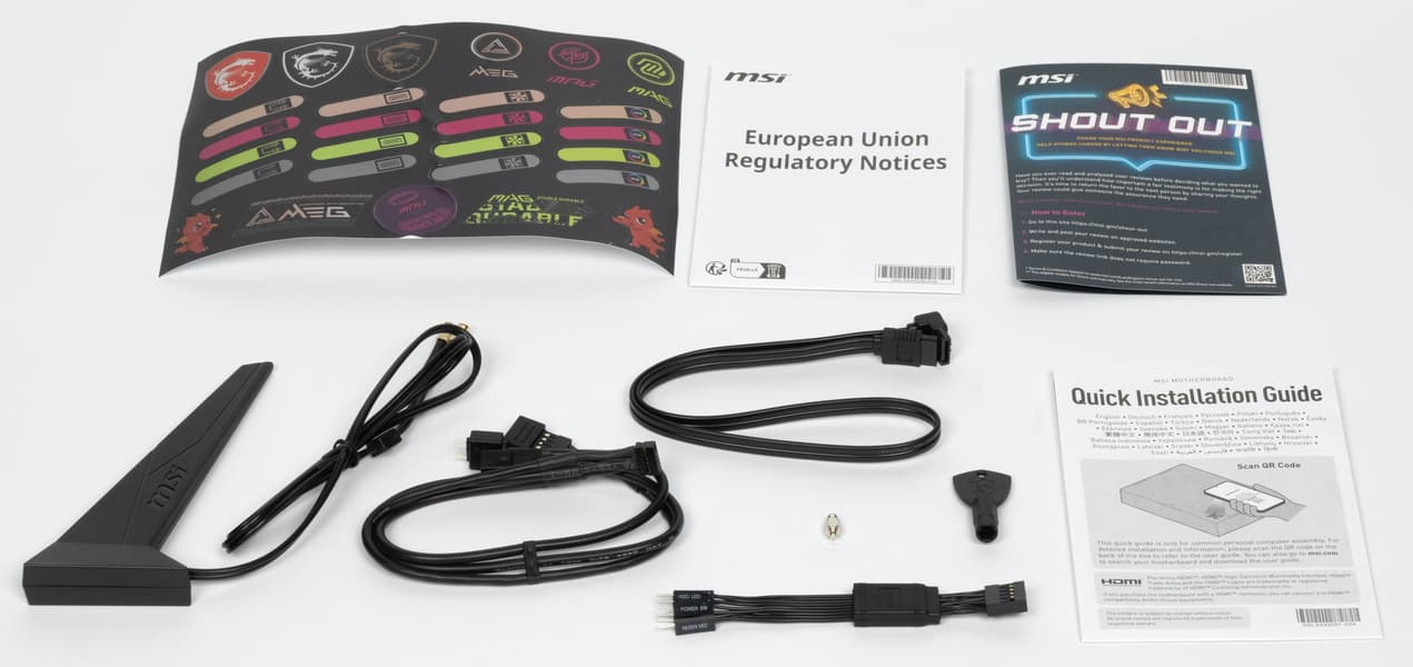 MSI MAG B850 Tomahawk WiFi поставляется в коробке стандартного дизайна серии MAG. Комплект размещен под платой в отдельном отсеке.