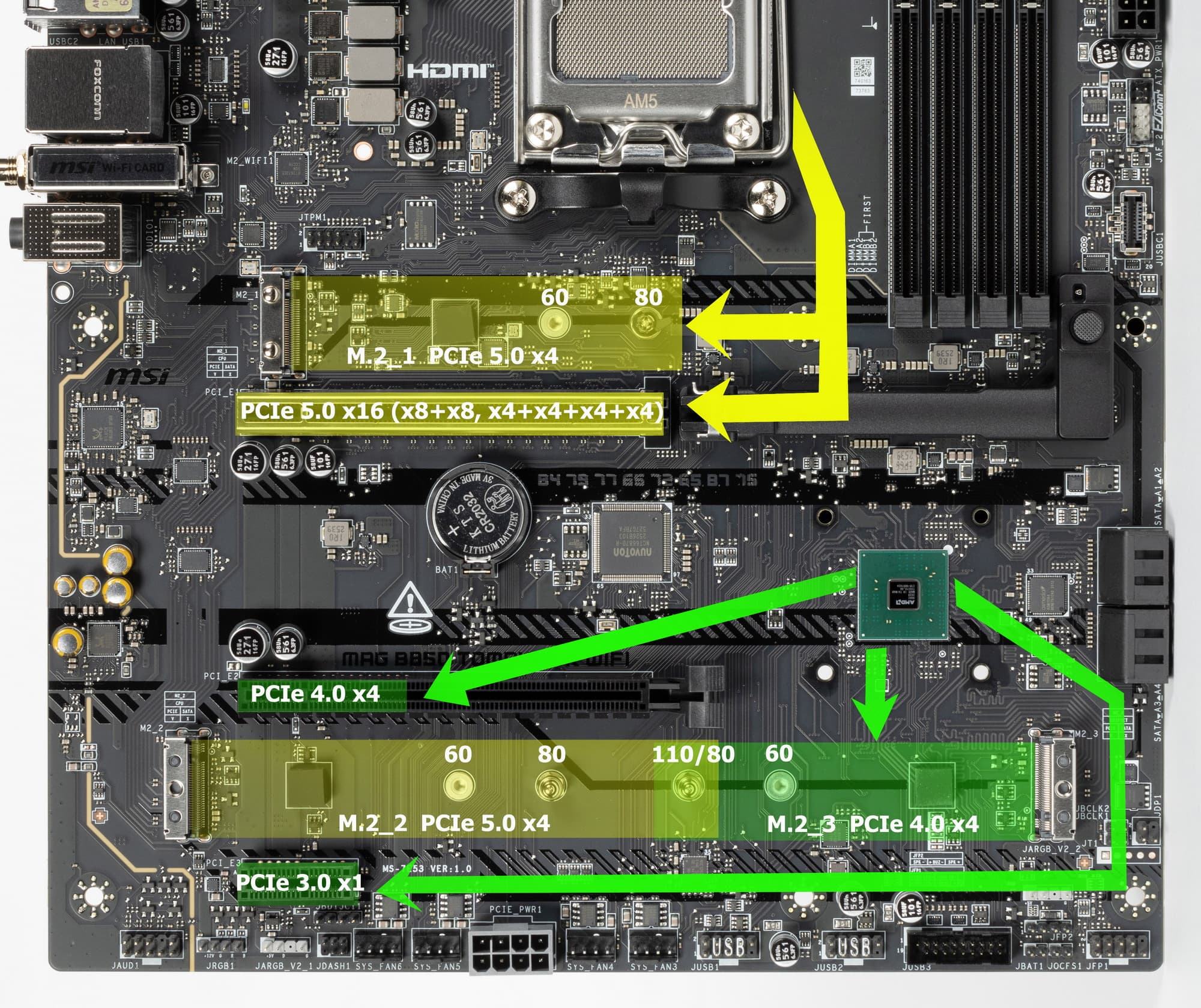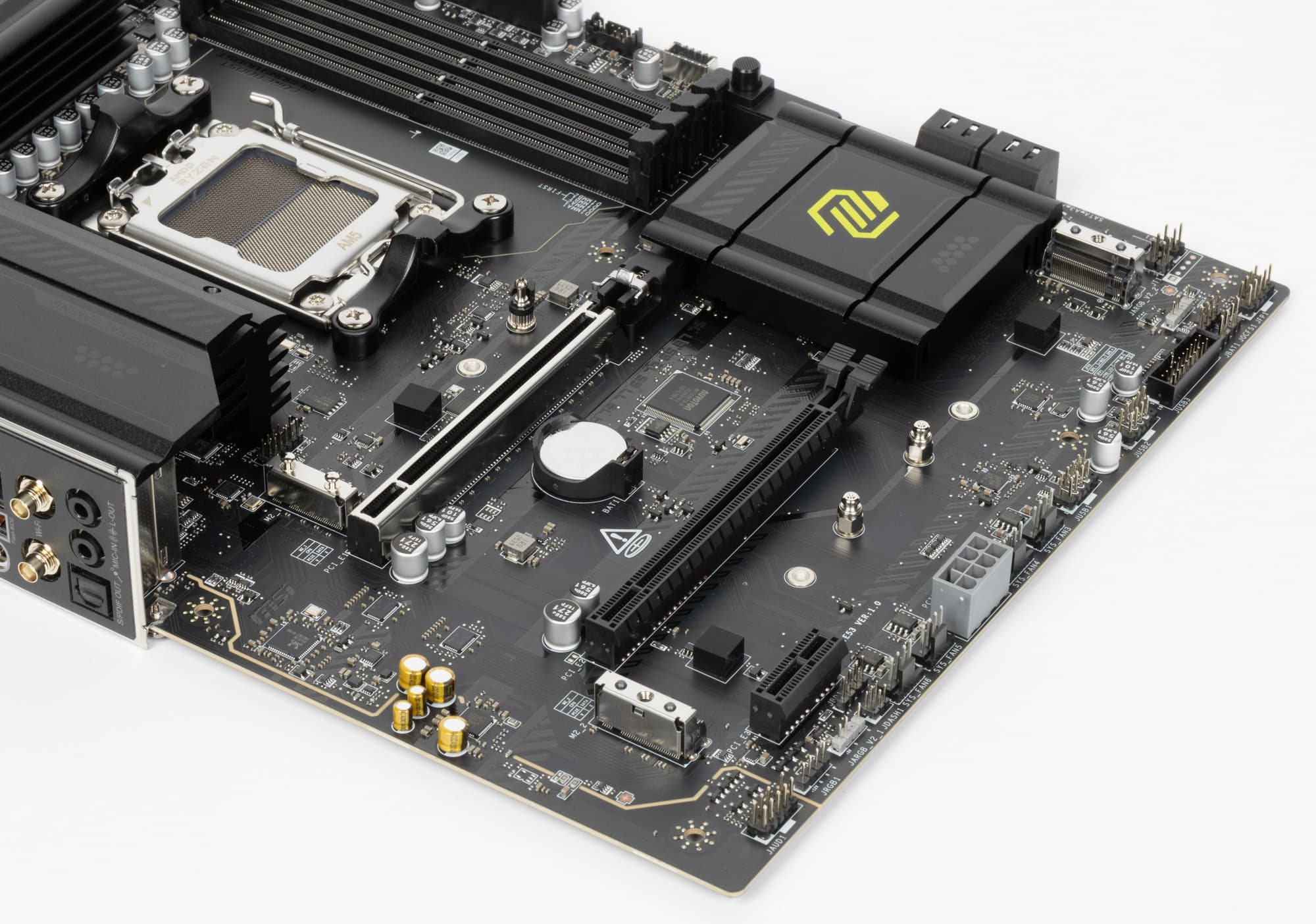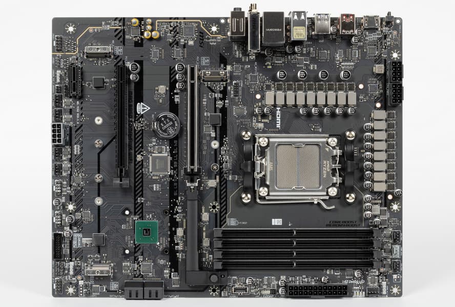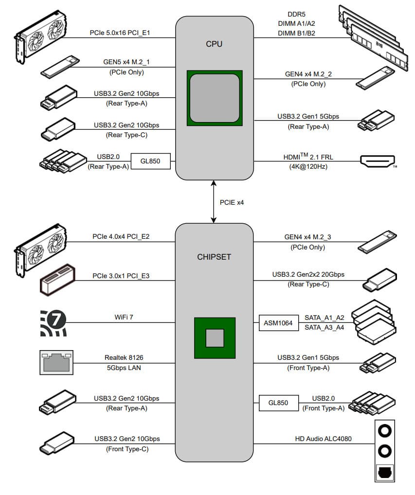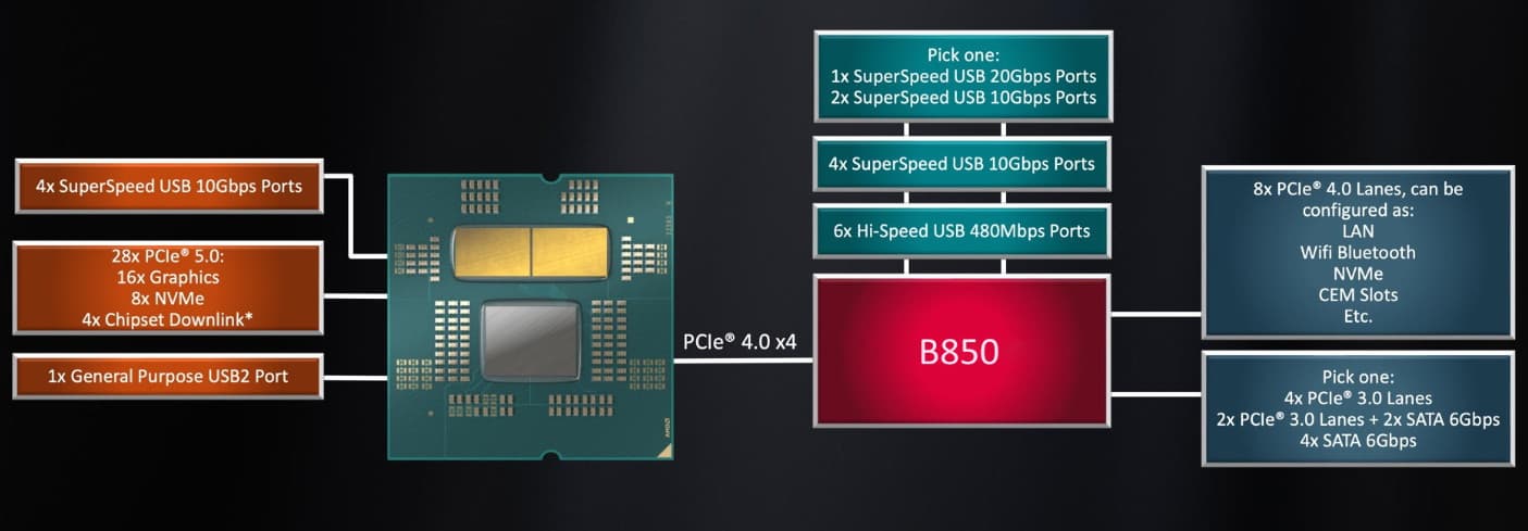 Стоит напомнить, что чипсет B850 физически представляет собой все тот же чип Promontory 21, лежащий в основе чипсетов X670/B650/X870. То есть AMD B850 – это по сути B650 (от процессора на слоты и порты могут идти линии PCIe как версии 5.0, так и 4.0 – на выбор производителя), нет обязательной поддержки USB4, но при этом имеется опция разделения 16 линий для видеокарты на x8+x8 – что являлось прерогативой B650E).