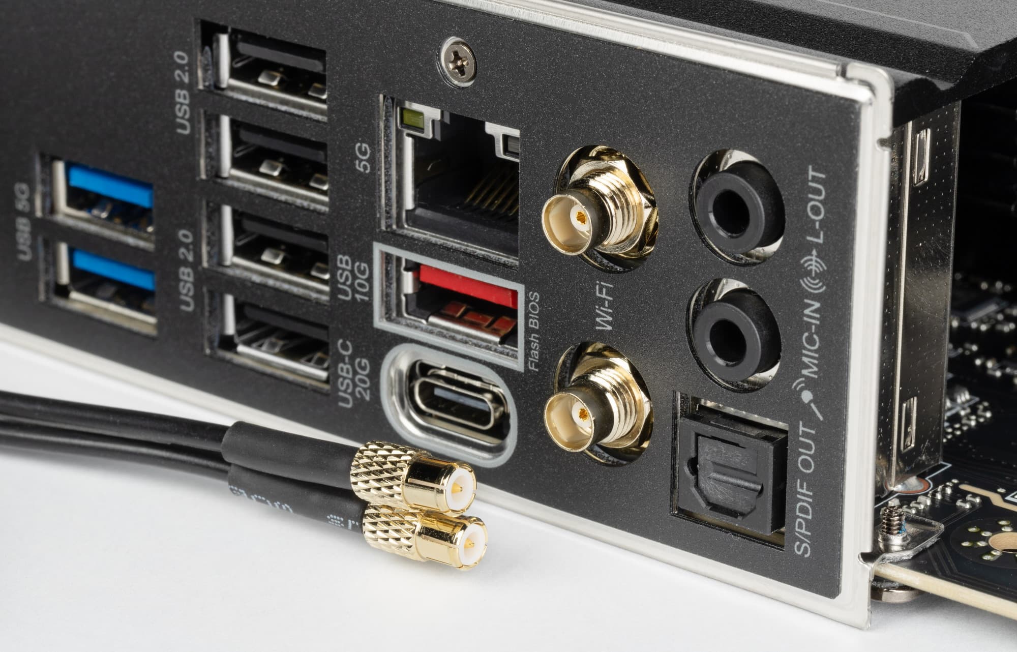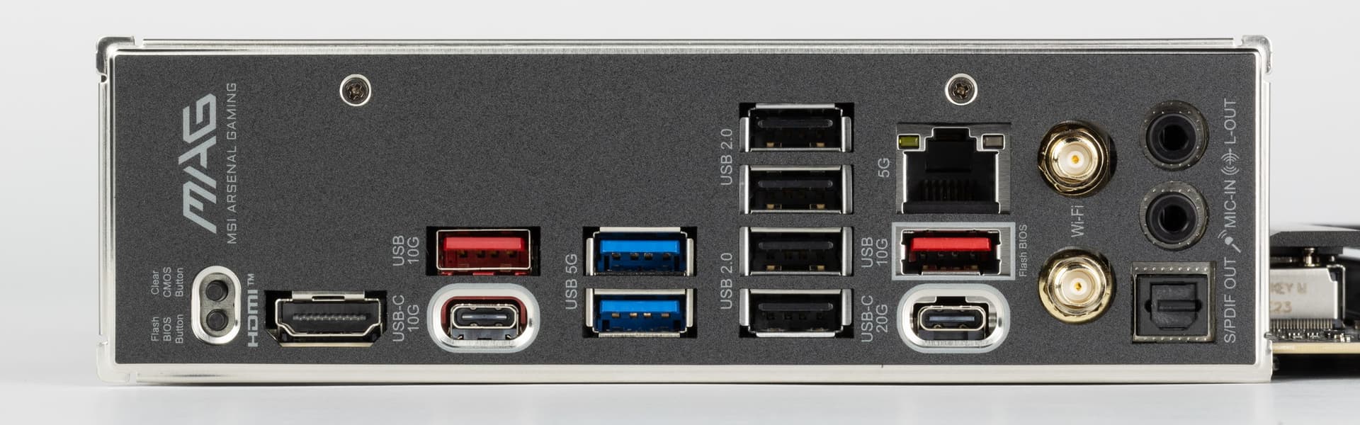 4 × USB 2.0 (Type-A) 1 × USB 3.2 Gen2x2 (Type-C) 1 × USB 3.2 Gen2 (Type-C) 2 × USB 3.2 Gen2 (Type-A) 2 × USB 3.2 Gen1 (Type-A) 1 × RJ-45 2 аудиоразъема типа миниджек 1 оптический аудиоразъем S/PDIF 1 × HDMI (выход) 1 кнопка сброса CMOS 1 кнопка обновления прошивки BIOS - Flash BIOS 2 антенных разъема