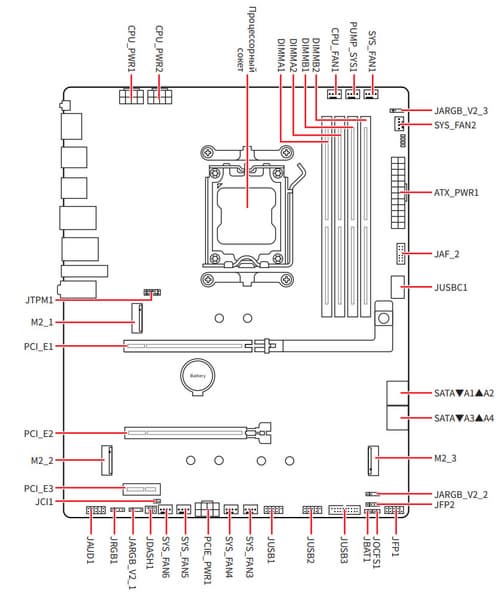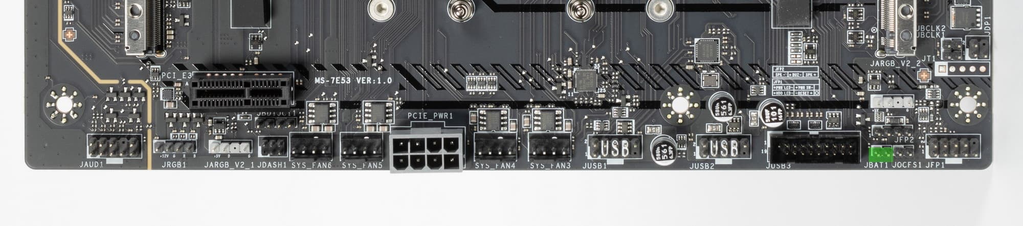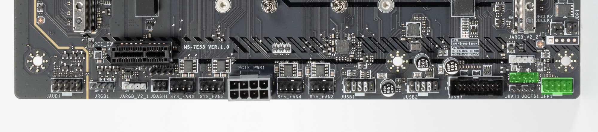 24-контактный разъем питания ATX 2 8-контактных разъема питания EPS12V 1 8-контактный разъем питания PCIe 1 слот M.2 (E-key), занят адаптером беспроводных сетей 1 разъем для подключения порта USB 3.2 Gen2 Type-C 1 разъем для подключения 2 портов USB 3.2 Gen1 2 разъема для подключения 4 портов USB 2.0 8 разъемов для подключения 4-контактных вентиляторов и помп ЖСО 3 разъема для подключения адресуемой ARGB-ленты 1 разъем для подключения неадресуемой RGB-ленты 1 разъем аудио для передней панели корпуса 1 переключатель сброса CMOS 1 разъем JOC_FS1 для включения безопасной загрузки с настройками по умолчанию 2 разъема JBLK для настроек частоты работы базовой шины 1 разъем для подключения систем безопасности TPM 1 разъем для подключения контроллера настройки (приобретается отдельно) 2 разъема для подключения управления с передней панели корпуса 1 разъем JAF_2 для подключение проприетарных систем охлаждения от MSI