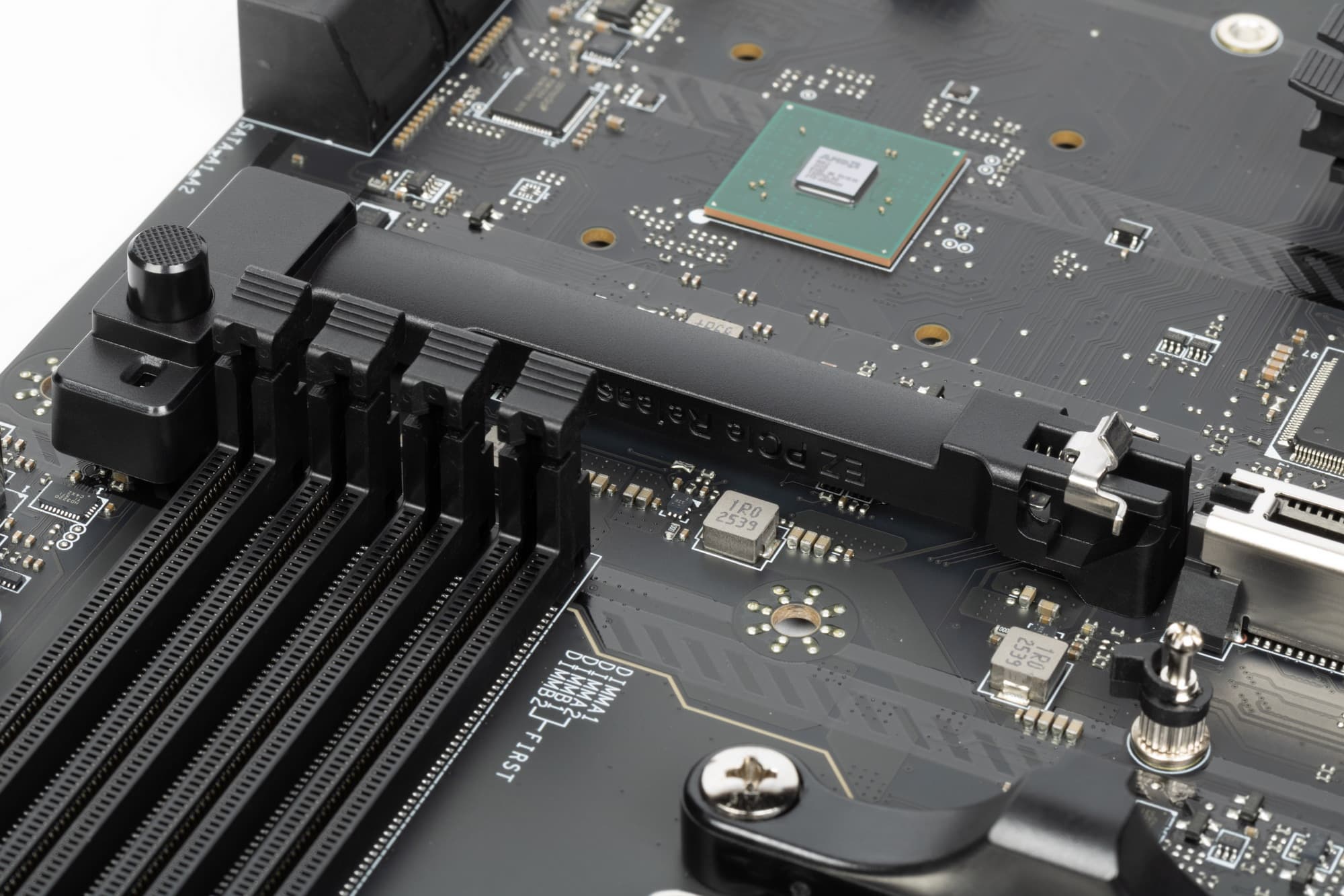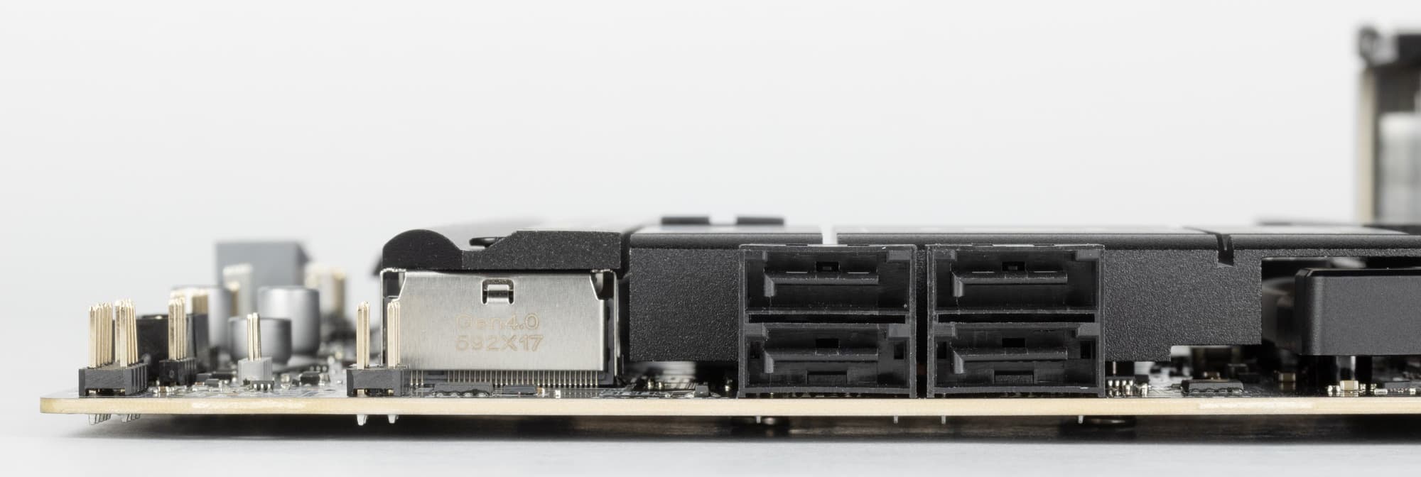 У нее 17 портов USB разных видов, включая 1 USB3.2 Gen2×2 (в виде порта Type-C на задней панели), 4 USB 3.2 Gen2 (в виде портов Type-A и Type-C) и 4 USB 3.2 Gen1 (внутренние и Type-A). Также плата предлагает слот PCIe х16, получающий от процессора 16 линий PCIe 5.0, также «длинный» слот PCIe x16 с четырьмя линиями PCIe 4.0, и один слот PCIe x1 (PCIe 3.0). Оба последних слота подключенны к чипсету. Делений ресурсов между портами и слотами у платы нет.