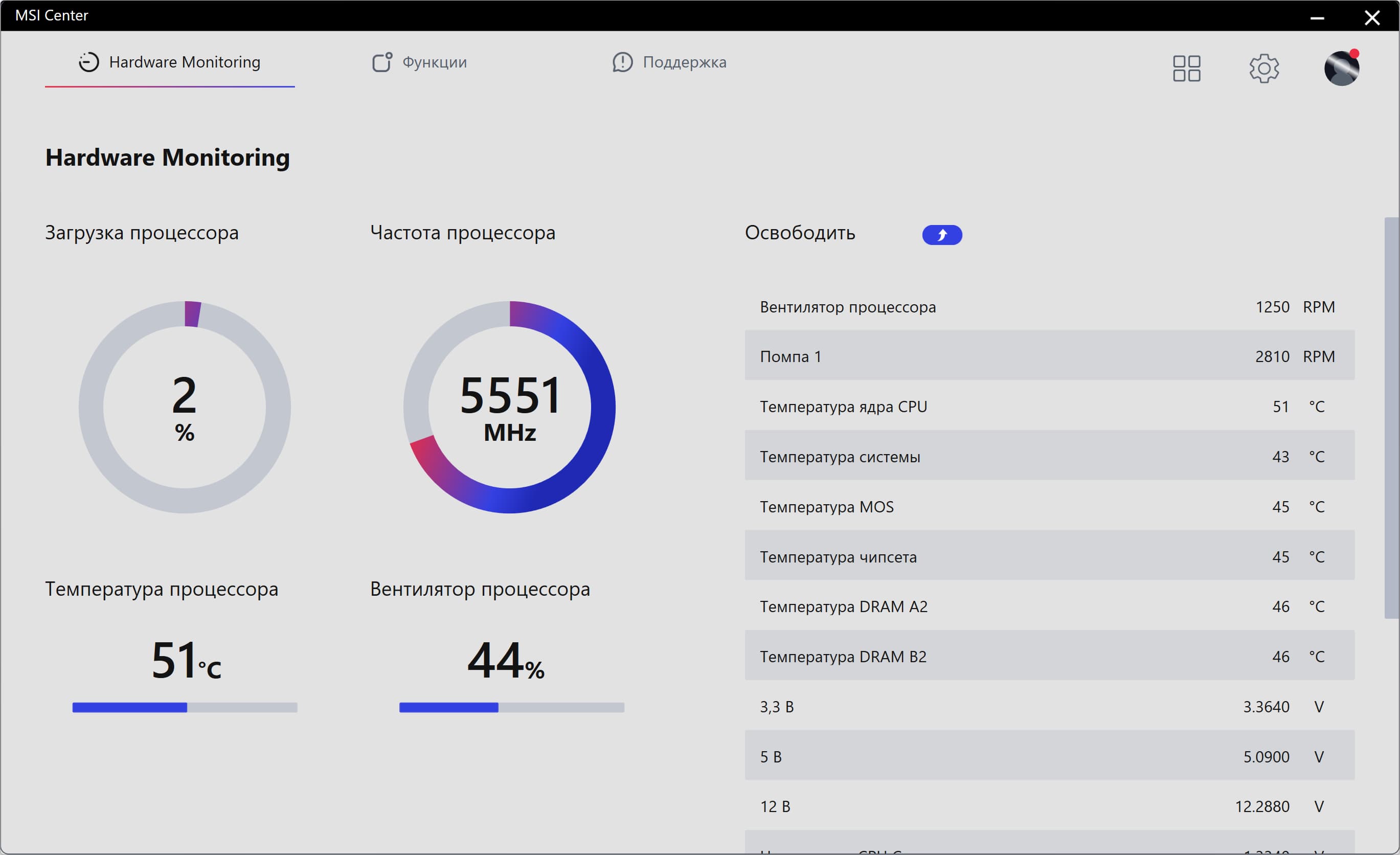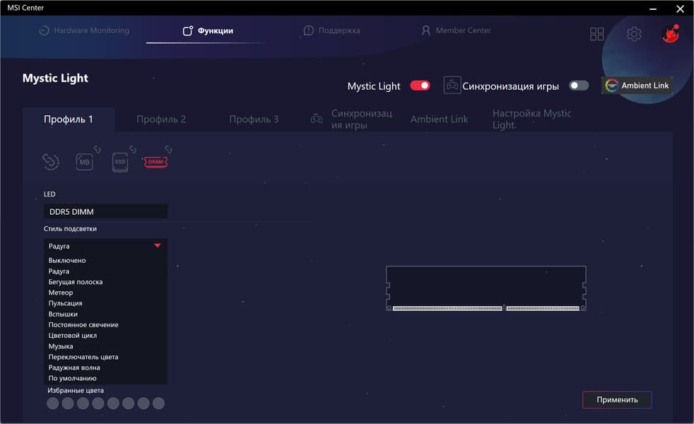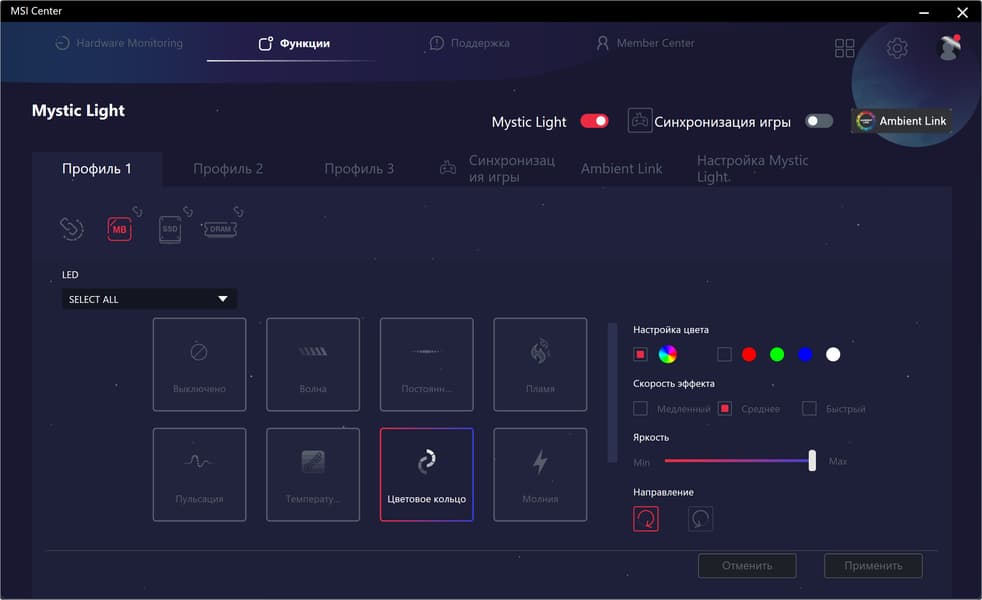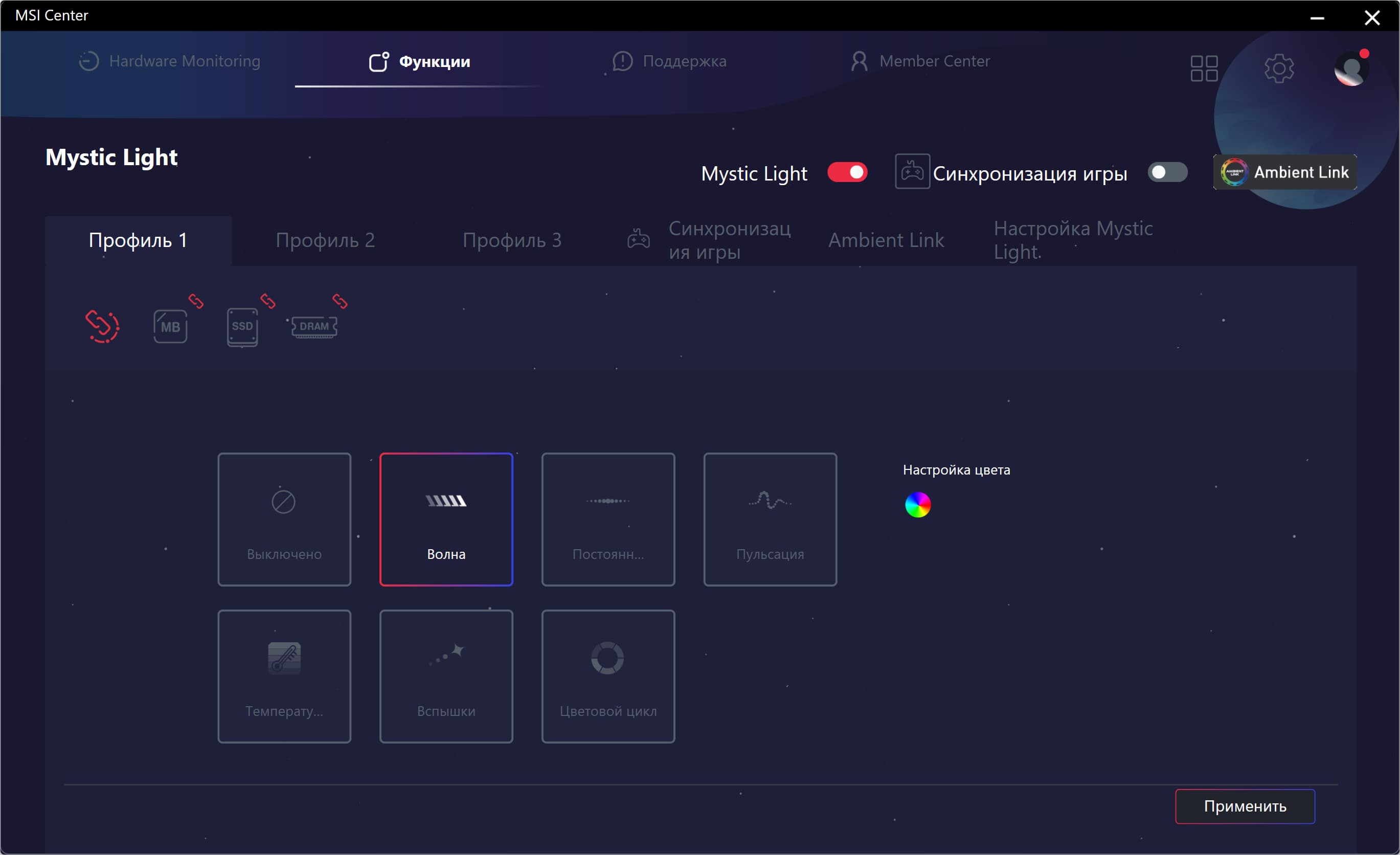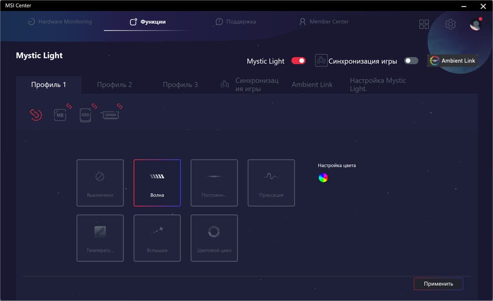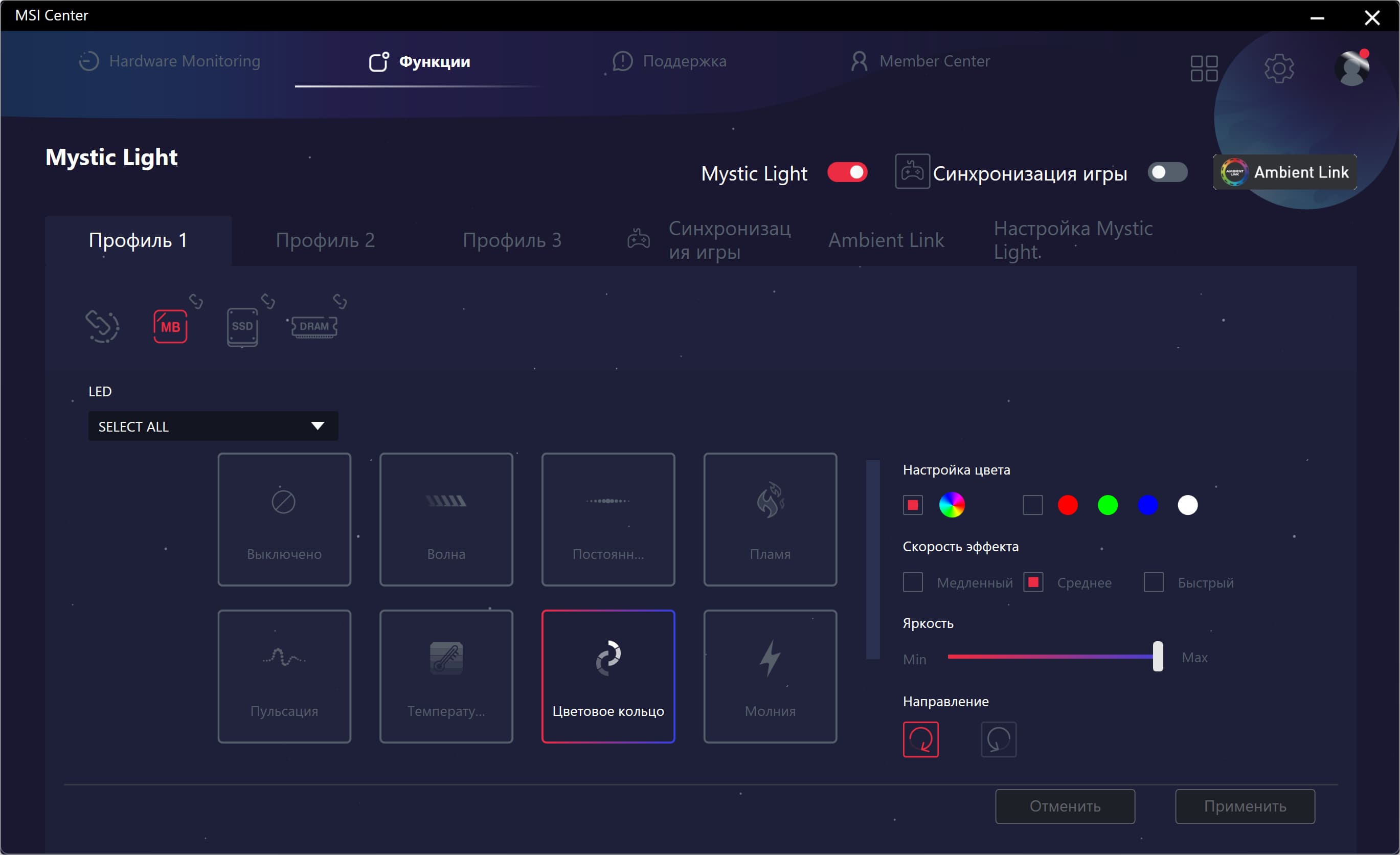 Управление подсветкой осуществляется с помощью утилиты Mystic Light, входящей в состав ПО MSI Center.