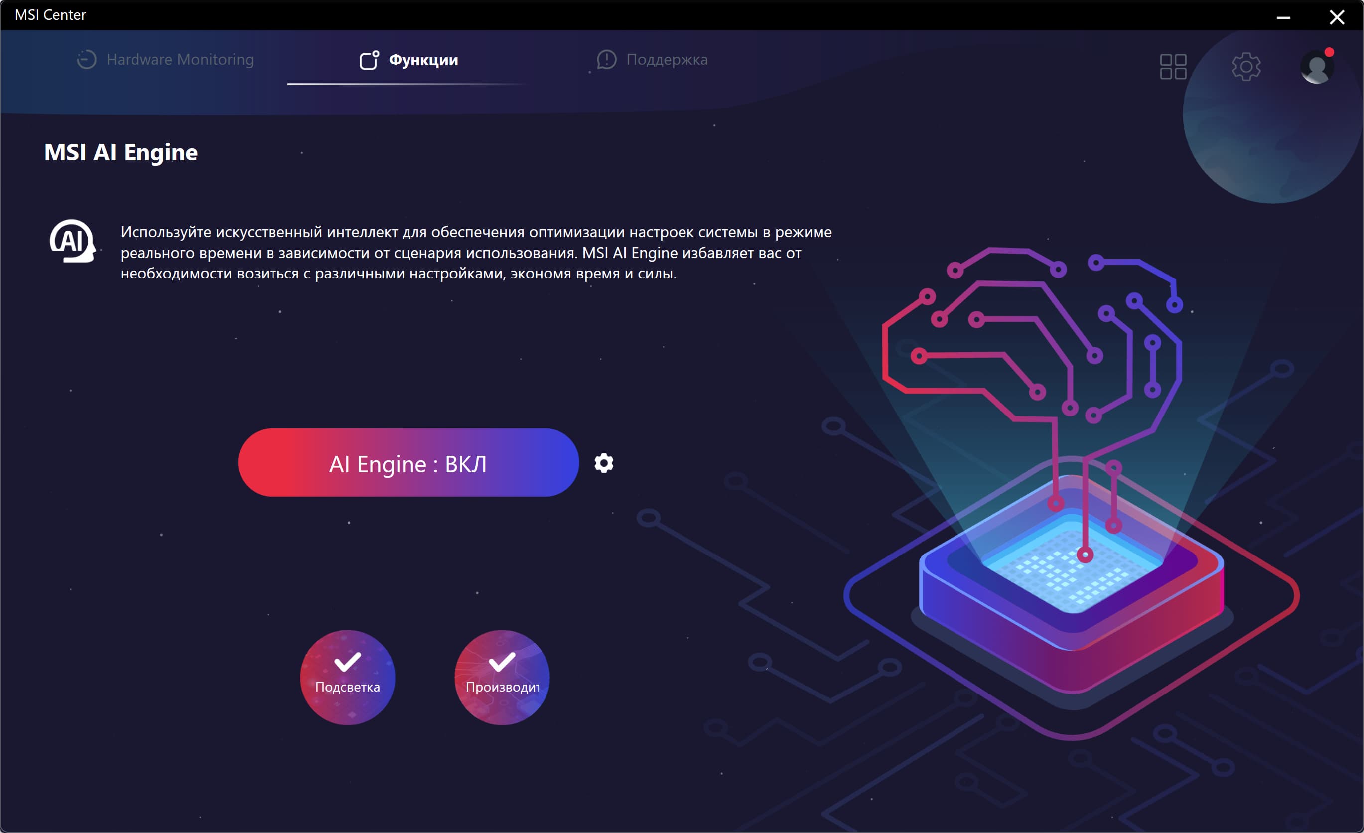 Можно настраивать работу платы не только частотам или вольтажам, но и регулировать работу вентиляторов. Следует особо отметить новую функциональность ПО — управление всеми вентиляторами с помощью ИИ, когда точками отсчета являются нагрев CPU и GPU (то есть нагрев видеокарты также учитывается), в расчет берутся показания через драйверы от Nvidia, AMD, Intel, а также собственного датчика на материнке возле видеокарты.