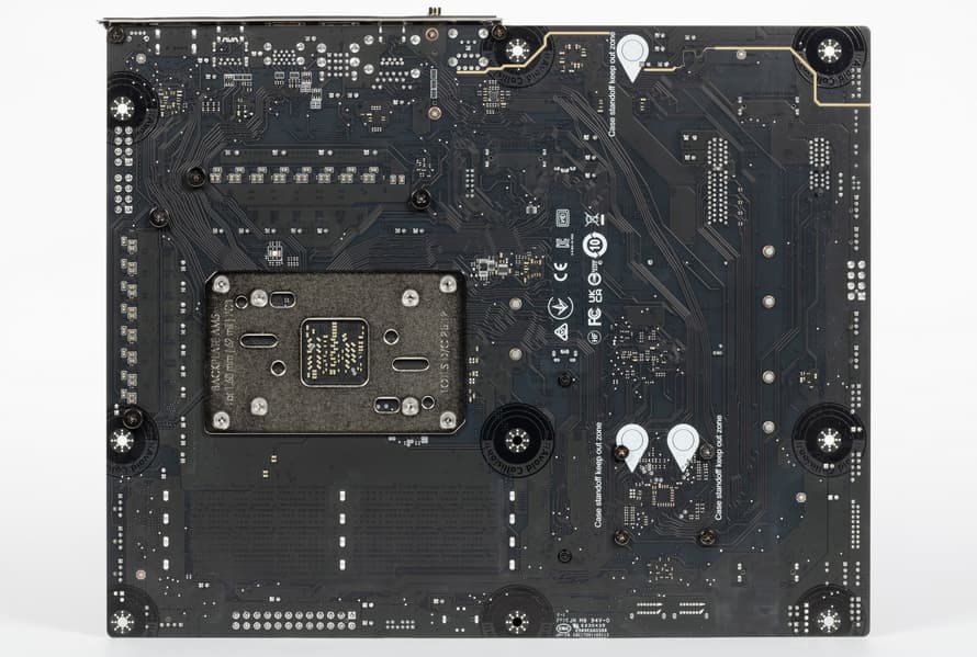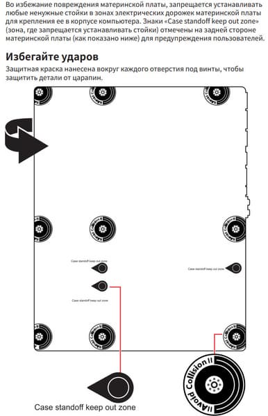 На тыльной стороне платы имеются маркировки в местах потенциального нахождения стоек в корпусе для крепления матплат в местах, где у данной платы нет крепежных отверстий.