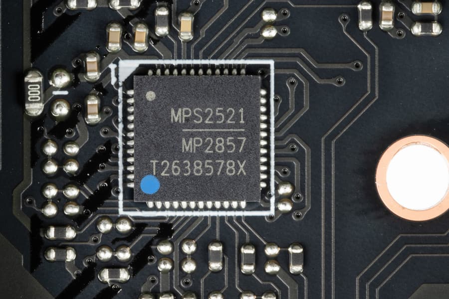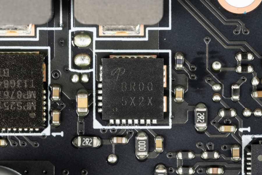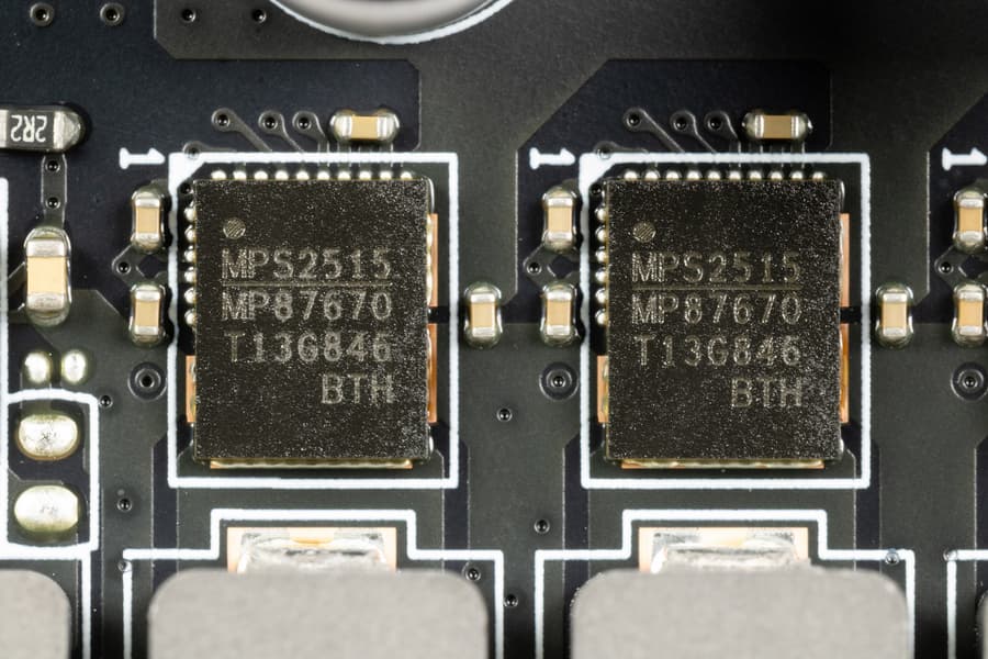 Управляет этими наборами фаз VCore и SoC (14+2) ШИМ-контроллер MP2857 от того же производителя MPS.