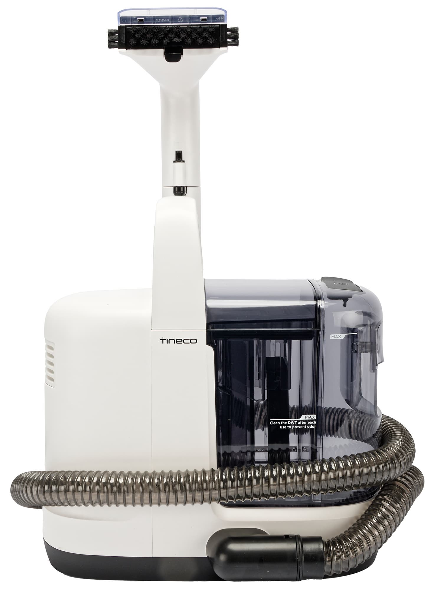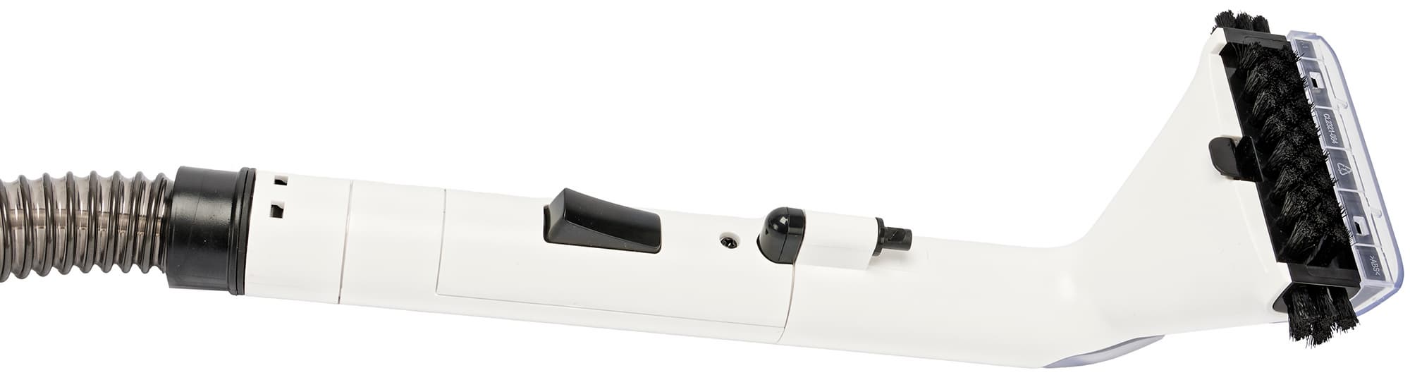 Корпус соединяется с щеткой двойным шлангом. Шланг длиной 140 см имеет несъемную 20-сантиметровую рукоятку с одной клавишей для подачи воды. По гофрированной пластиковой трубке диаметром 3 см в отсек для отходов засасываются отработанная вода и мелкий мусор. По тонкой трубке в рабочую зону поступает чистая вода с моющим средством.