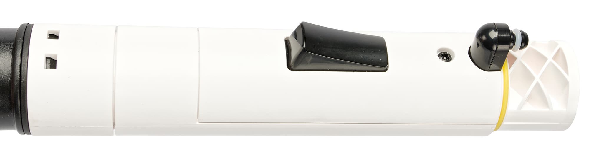 На конце рукоятки находится сопло для выхода жидкости и место крепления съемных насадок. Насадки надежно защелкиваются при полной установке и отщелкиваются путем нажатия на белую крохотную кнопку с противоположной стороны рукоятки.