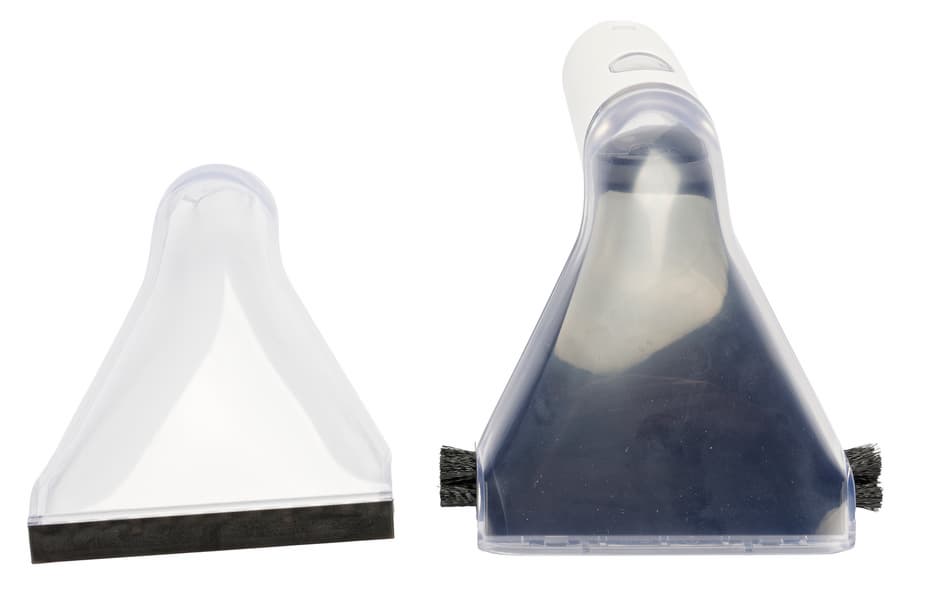 А вот прозрачные съемные крышки, под которыми прибор засасывает мелкий мусор и грязную воду — разные. Одна из них стандартная и ее, в комбинации со съемной щетиной, предполагается использовать для чистки ковров и мягкой мебели.