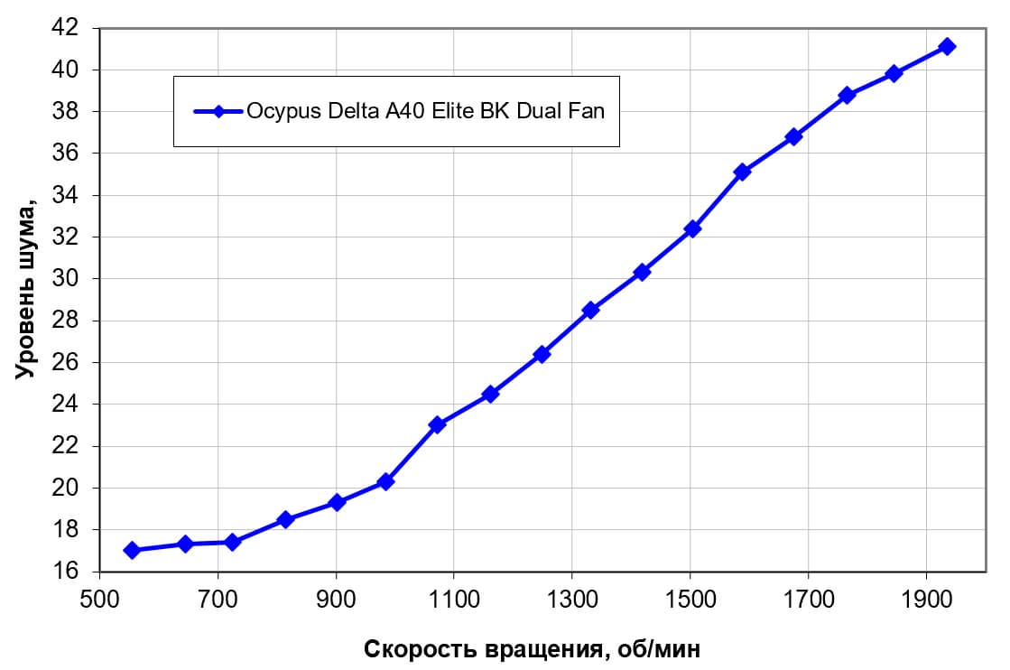Зависит, конечно, от индивидуальных особенностей и других факторов, но в случае кулеров где-то от 40 дБА и выше шум с нашей точки зрения очень высокий для настольной системы, от 35 до 40 дБА уровень шума относится к разряду терпимых, ниже 35 дБА шум от системы охлаждения не будет сильно выделяться на фоне типичных небесшумных компонентов ПК — вентиляторов корпусных, на блоке питания, на видеокарте, а также жестких дисков, а где-то ниже 25 дБА кулер можно назвать условно бесшумным. Фоновый уровень был равен 16,1 дБА (условное значение, которое показывает шумомер). К нему мы стабильно пришли бы при отключении вентиляторов (естественно), но несложно заметить, что работа на минимальных оборотах и так обеспечивает шум, практически неотличимый от фонового без приборов. В этом плане два вентилятора ничем не хуже одного. На максимальных или близких к тому оборотах пара работает всё же немного громче одиночной «вертушки», но странно было бы ожидать чего-то иного. Достаточно и того, что разница не принципиальная.