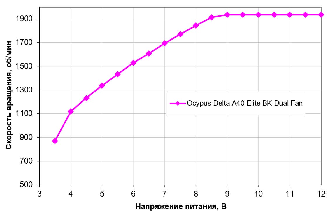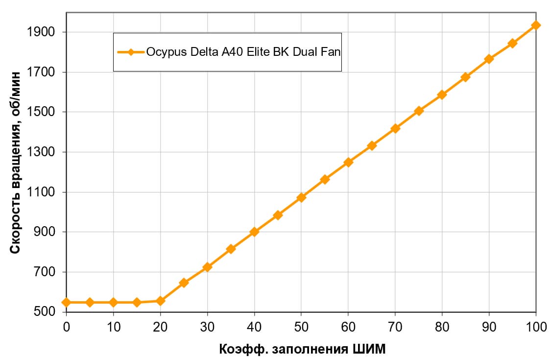 Отличный результат — монотонный и практически линейный рост скорости вращения при изменении коэффициента заполнения (КЗ) от 20% до 100% и довольно широкий диапазон регулировки. Ниже 20% скорость вращения стабилизирована примерно на 550 об/мин, так что в гибридной системе охлаждения с пассивным режимом на минимальной нагрузке придется прибегнуть к регулировке напряжения для остановки вентиляторов.