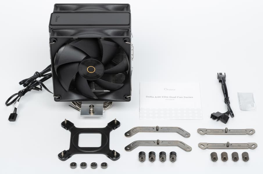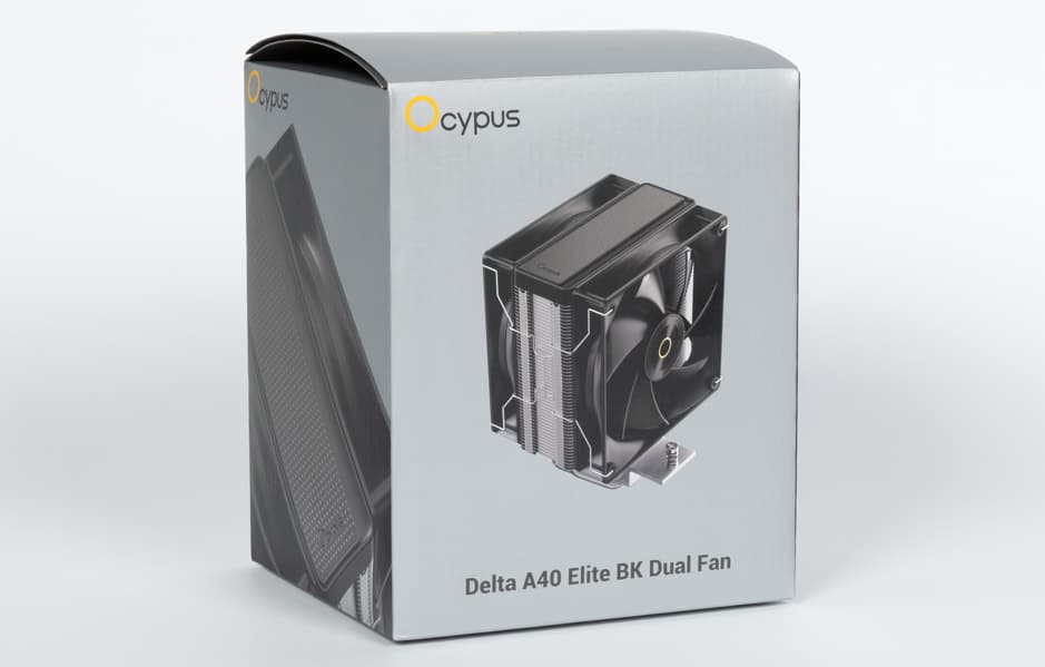 Поставляется процессорный охладитель Ocypus Delta A40 BK Elite Dual Fan в коробке из относительно тонкого картона неброских цветов. Чего в данном случае достаточно, поскольку внутри все компоненты надежно фиксируются парой «крышек» из вспененного полиэтилена. Сам главный герой изображен прямо на коробке, так что не перепутаешь. В нашем случае, как несложно догадаться, речь идет о модели черного цвета. Доступен и белый — с индексом «WH» вместо «BK». Но сразу скажем, что реальных различий между ними меньше обычного, поскольку сами радиаторы в любом случае серебристые. Да и вообще, как нам кажется, при выборе такой модели цвет не слишком важен (так что имеет смысл смотреть, что окажется дешевле в магазине) — для визуалов у компании есть украшенные богаче кулеры разного уровня.