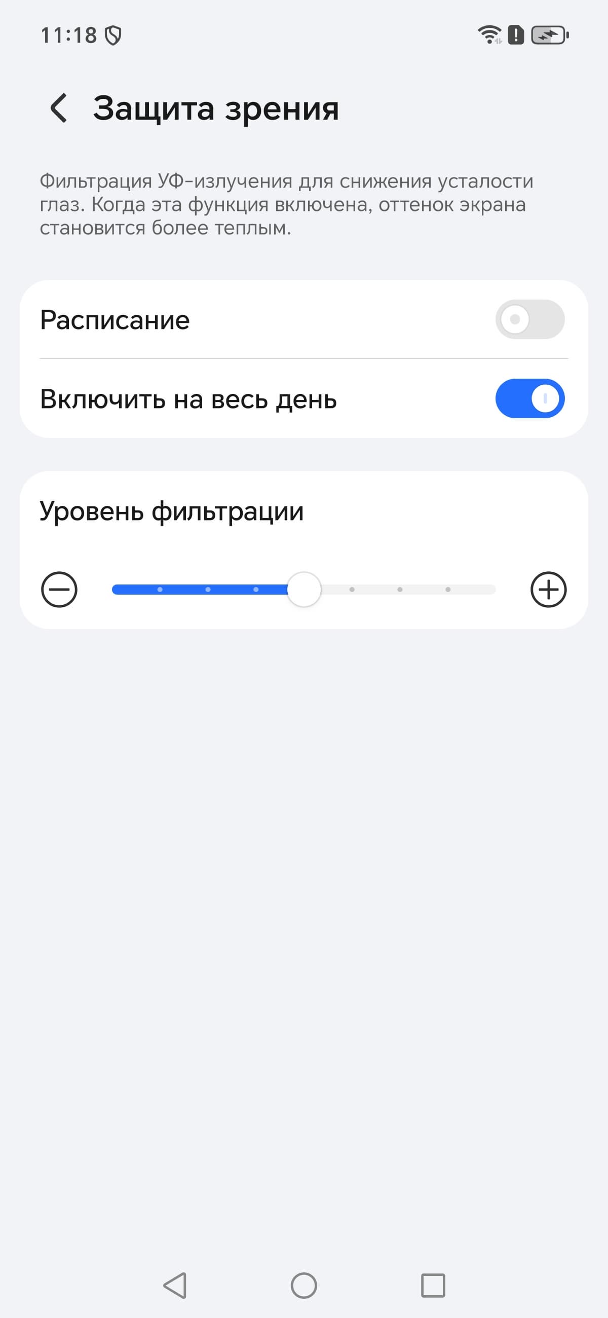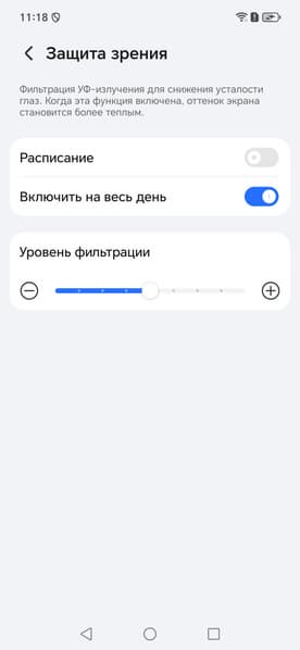 В описании режима Защита зрения приведена как минимум спорная информация про УФ-излучение (его нет — см. спектры) и усталость глаз. В принципе, яркий свет может приводить к нарушению суточного (циркадного) ритма (см. статью про iPad Pro с дисплеем 9,7 дюйма), но все решается снижением яркости до низкого, но еще комфортного уровня, а искажать цветовой баланс, уменьшая вклад синего, нет абсолютно никакого смысла.