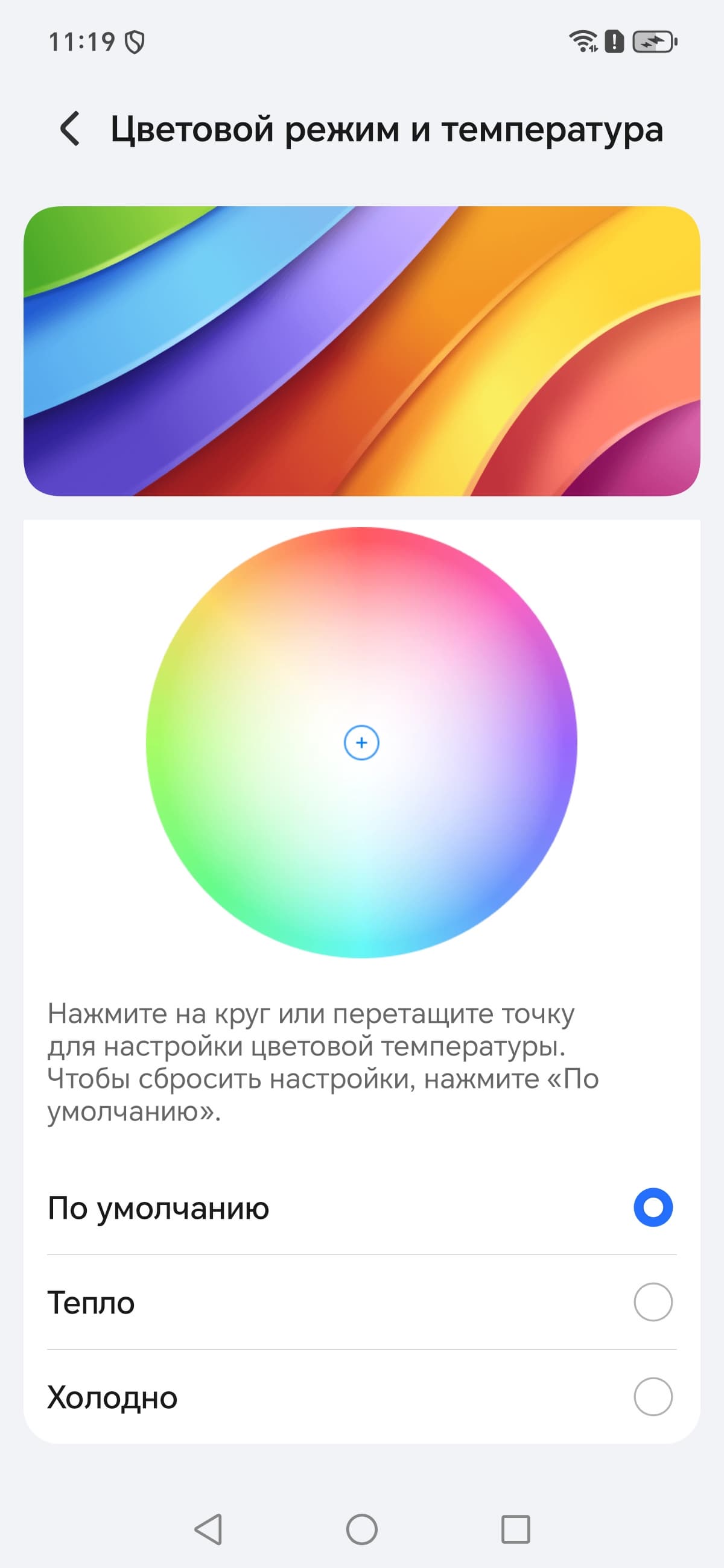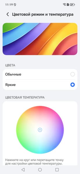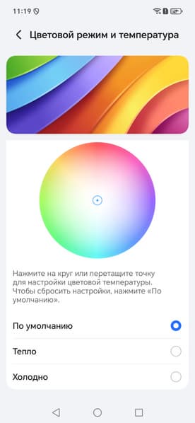 Дополнительно есть возможность скорректировать цветовой баланс с помощью выбора профиля цветовой температуры или регулировки оттенка на цветовом круге.