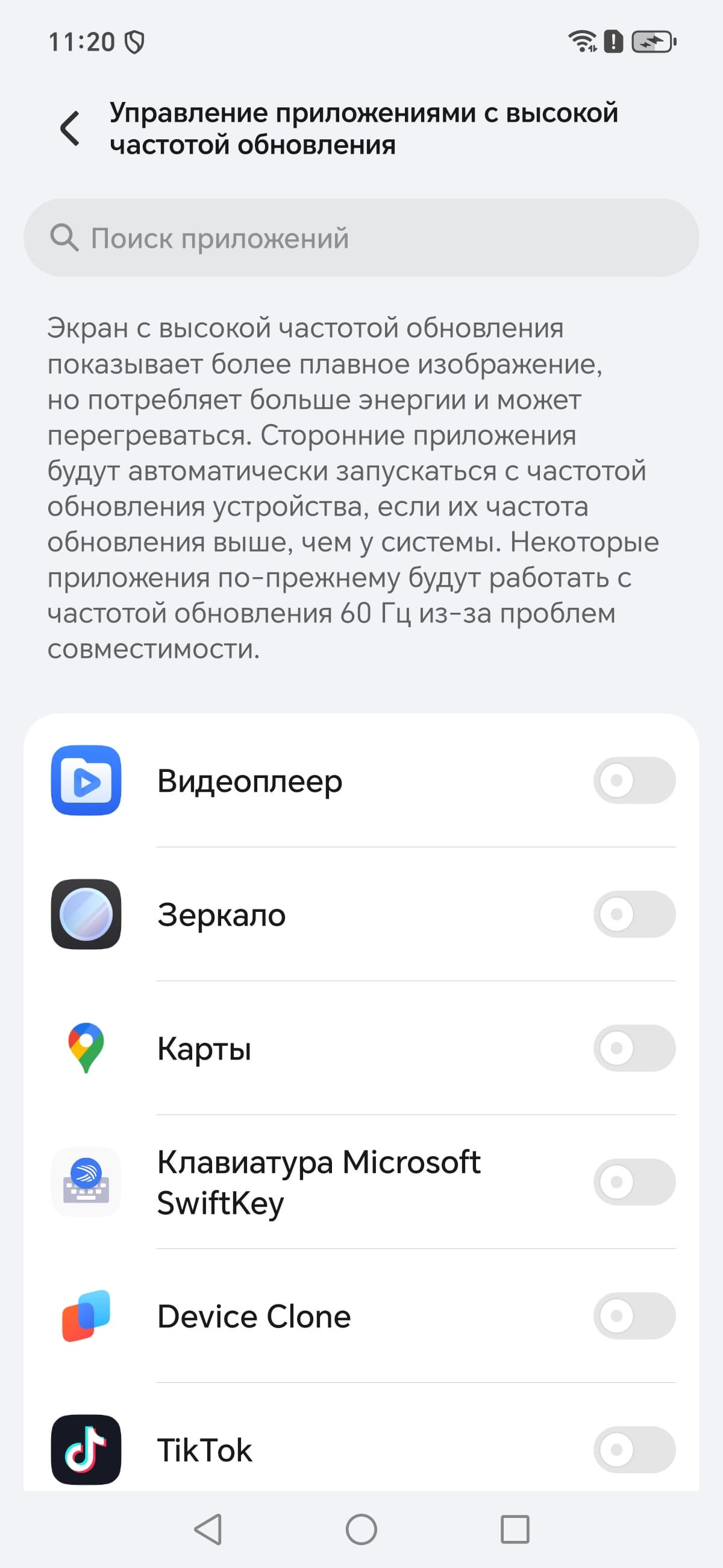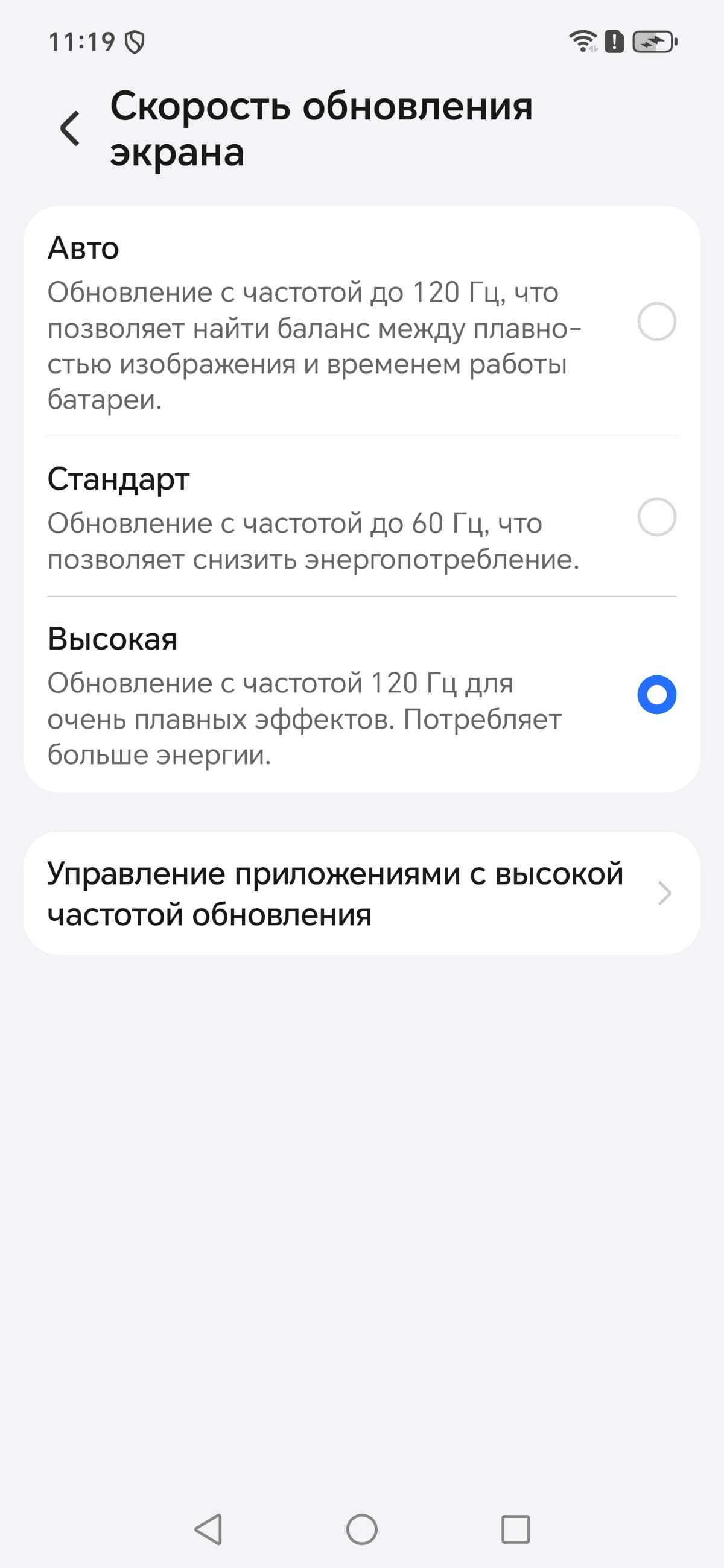 В настройках экрана можно включить режим с повышенной до 120 Гц частотой обновления.