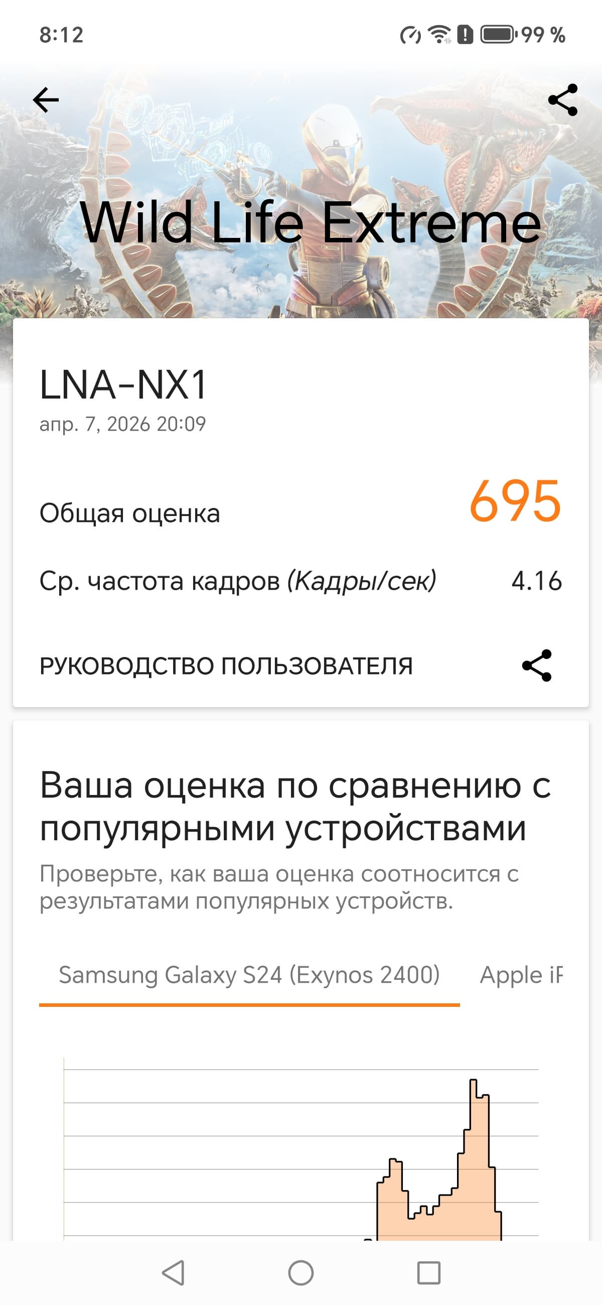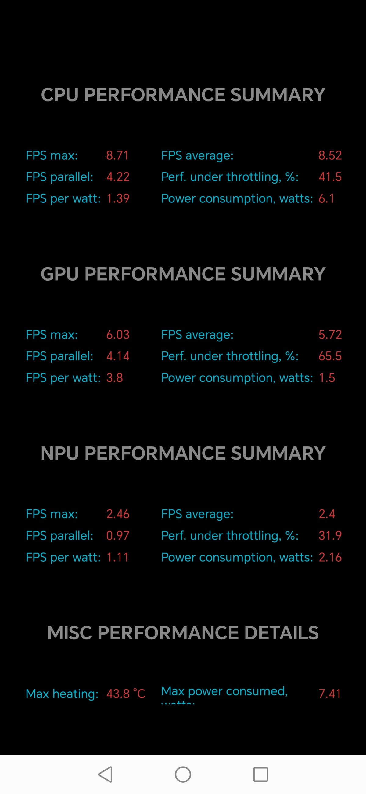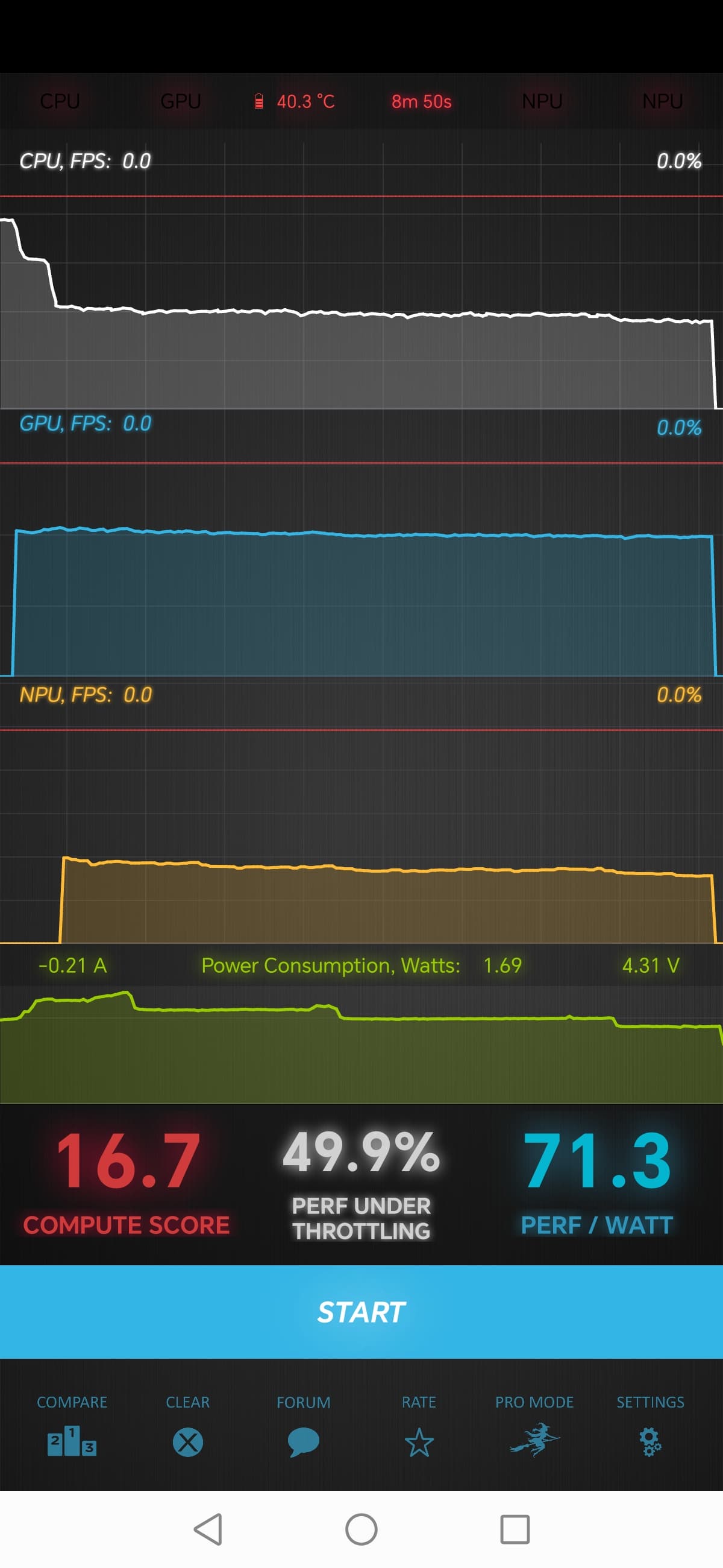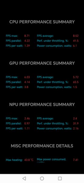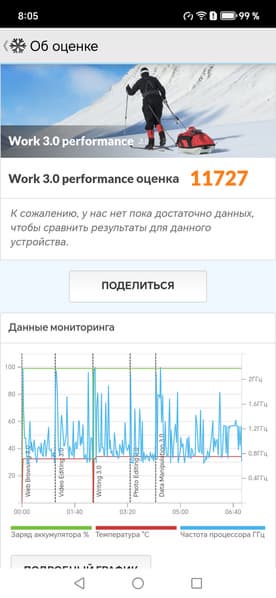 Тест на снижение производительности при нагреве мы проводим с помощью программы Burnout Benchmark, которая позволяет нагружать CPU, GPU и NPU. Уровень тротлинга GPU средний.