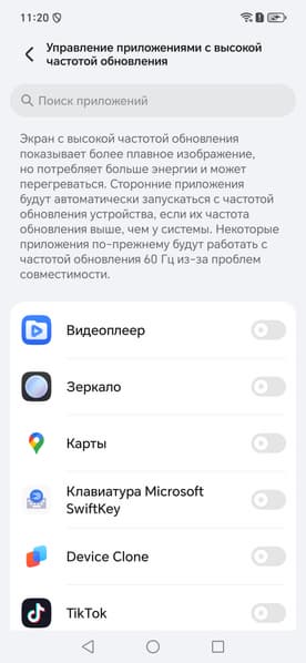 Характер модуляции при этом не меняется. По факту режим всегда динамичный и, если не касаться экрана, то частота обновления через пару секунд может снижаться как минимум до 60 Гц (по данным мониторинга). Данной настройкой пользователь ограничивает только максимальную частоту обновления.