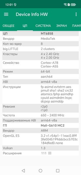 - SoC Mediatek Dimensity 7100 Elite, 8 процессорных ядер (4×Cortex-A78 @2,4 ГГц + 4×Cortex-A55 @2,0 ГГц)