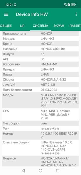 Основные характеристики Honor 600 Lite (модель LNA-NX1)