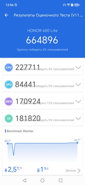 Смартфон Honor 600 Lite работает на восьмиядерной SoC Mediatek Dimensity 7100 Elite, которая производится по нормам 6-нанометрового техпроцесса. Это платформа далеко не топовая, примерно нижне-среднего уровня, с ней смартфон набирает в AnTuTu 11 менее 700 тысяч баллов (флагманы набирают в этой версии теста уже под 4 млн). Производительность не очень высокая, ее достаточно для выполнения большинства стандартных организационных задач, но видеосъемка в 4К и/или с 60 fps недоступна, а в требовательных играх придется понижать уровень графики.