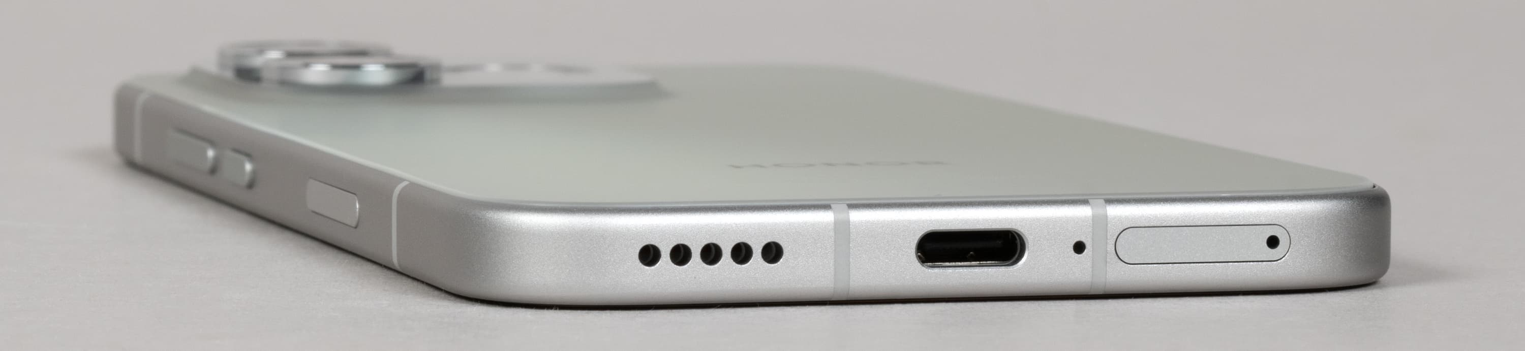 На торце снизу размещены динамик, разъем USB Type-C и микрофон. В выдвижной лоток можно установить 2 карты Nano-SIM, для карты памяти microSD места не предусмотрено.