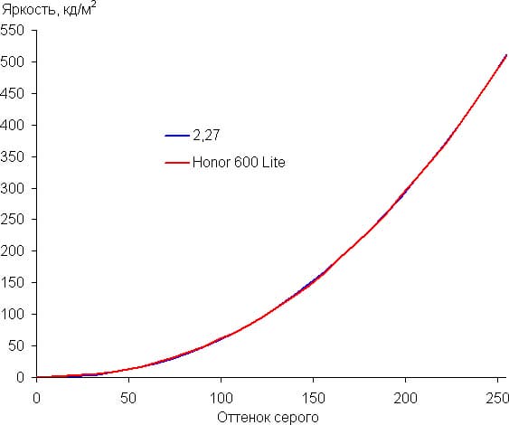 Построенная по 32 точкам с равным интервалом по численному значению оттенка серого гамма-кривая показала, что существенного завала нет ни в светах, ни в тенях. Показатель аппроксимирующей степенной функции равен 2,27, что близко к стандартному значению 2,2, при этом реальная гамма-кривая мало отклоняется от степенной зависимости: