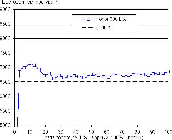 В случае профиля Обычные даже без коррекции (то есть по умолчанию) баланс оттенков на шкале серого хороший, так как цветовая температура близка к стандартным 6500 К, и отклонение от спектра абсолютно черного тела (ΔE) ниже 10, что для потребительского устройства считается хорошим показателем. При этом цветовая температура и ΔE мало изменяются от оттенка к оттенку — это положительно сказывается на визуальной оценке цветового баланса. (Самые темные области шкалы серого можно не учитывать, так как там баланс цветов не имеет большого значения, да и погрешность измерений цветовых характеристик на низкой яркости большая.)