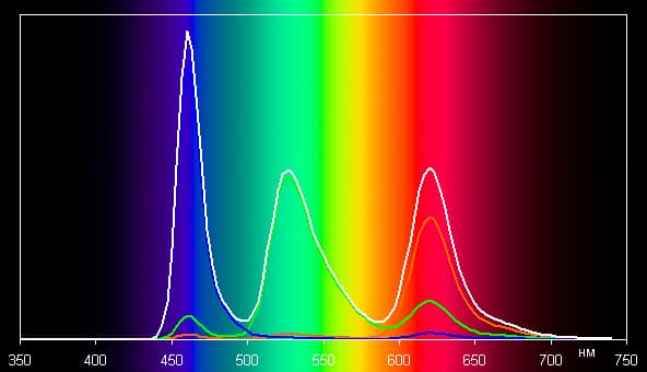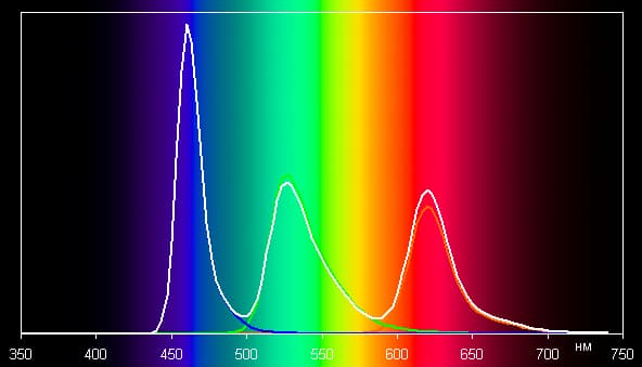 Спектры компонент (то есть спектры чистых красного, зеленого и синего цветов) очень хорошо разделены: