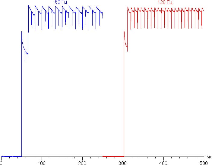 Переключение состояния элементов матрицы выполняется практически мгновенно, но на фронте включения может присутствовать ступенька, ширина которой зависит от текущей частоты обновления. Для частоты обновления в 60 Гц это примерно 17 мс, для 120 Гц — примерно 8 мс. Например, так выглядит зависимость яркости (вертикальная ось) от времени (горизонтальная ось) при переходе от черного к белому (режим 60 Гц и 120 Гц):