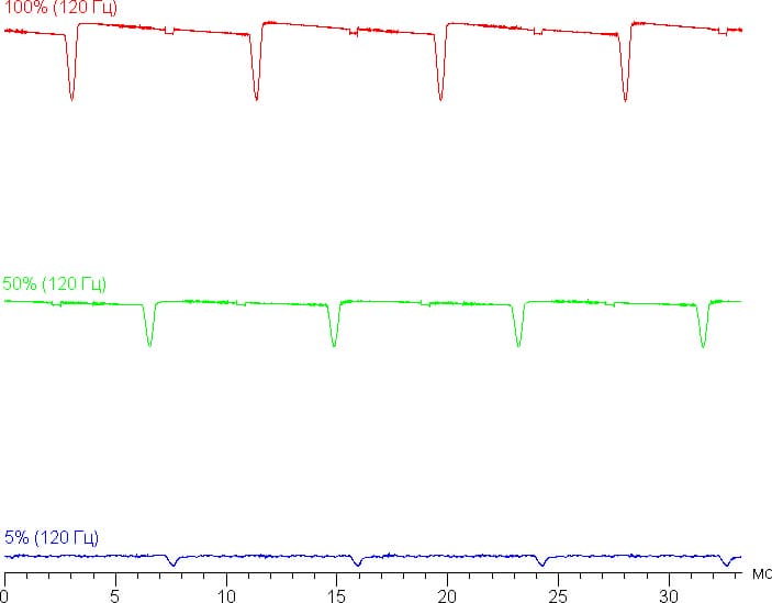 На любом уровне яркости присутствует значимая модуляция с частотой 120 Гц. На рисунках ниже приведены зависимости яркости (вертикальная ось) от времени (горизонтальная ось) для нескольких значений настройки яркости: