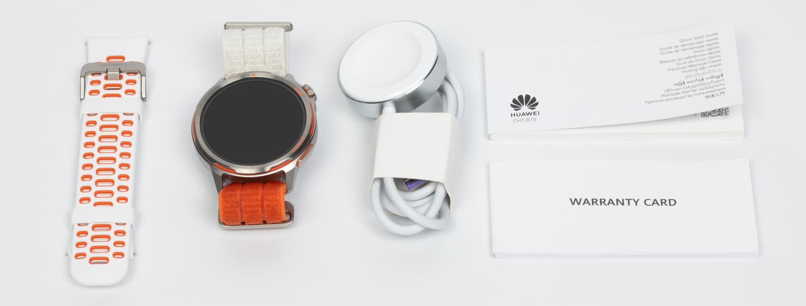 Главная особенность комплектации устройства — дополнительный ремешок из иного материала: силиконовый вместо базового нейлонового. Также имеется маленький буклет «Краткое руководство пользователя», гарантийный талон и беспроводная зарядка с USB-А на конце провода.