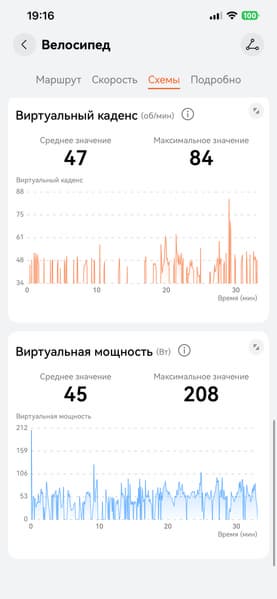 Можно заметить, что устройство достаточно подробно фиксирует все аспекты, включая даже угол наклона спуска/подъема дороги, средний виртуальный каденс (частота вращения педалей) и среднюю мощность. При желании вы можете посмотреть подробные графики по основным показателям.