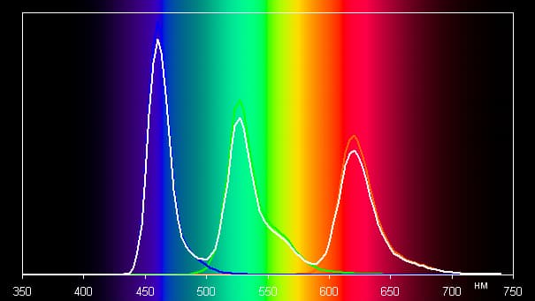 Спектры типичны для OLED — области первичных цветов хорошо разделены и имеют вид относительно узких пиков, перекрестное подмешивание цветов практически отсутствует:
