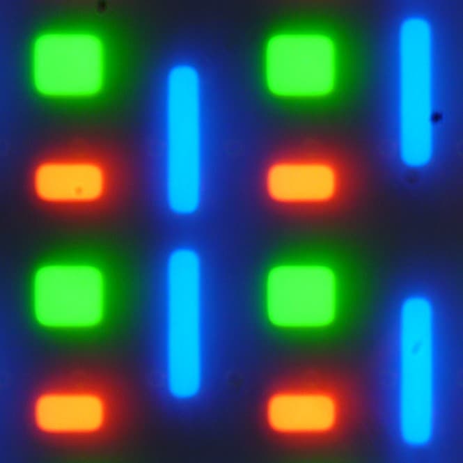 В этом экране используется OLED-матрица — активная матрица на органических светодиодах. Полноцветное изображение создается с помощью субпикселей трех цветов — красного (R), зеленого (G) и синего (B) в равном количестве, что подтверждается фрагментом микрофотографии: