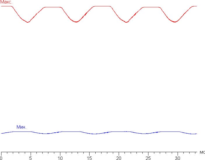 На графике зависимости яркости от времени определяется значимая модуляция с частотой 120 Гц, а при желании на некоторых изображениях при быстром движении часов относительно глаз можно выявить стробоскопических эффект. Однако по факту при обычном использовании мерцание не обнаруживается, так как фаза модуляции различается по площади экрана. На рисунке ниже приведены зависимости яркости (вертикальная ось) от времени (горизонтальная ось) для нескольких (условных) значений настройки яркости.