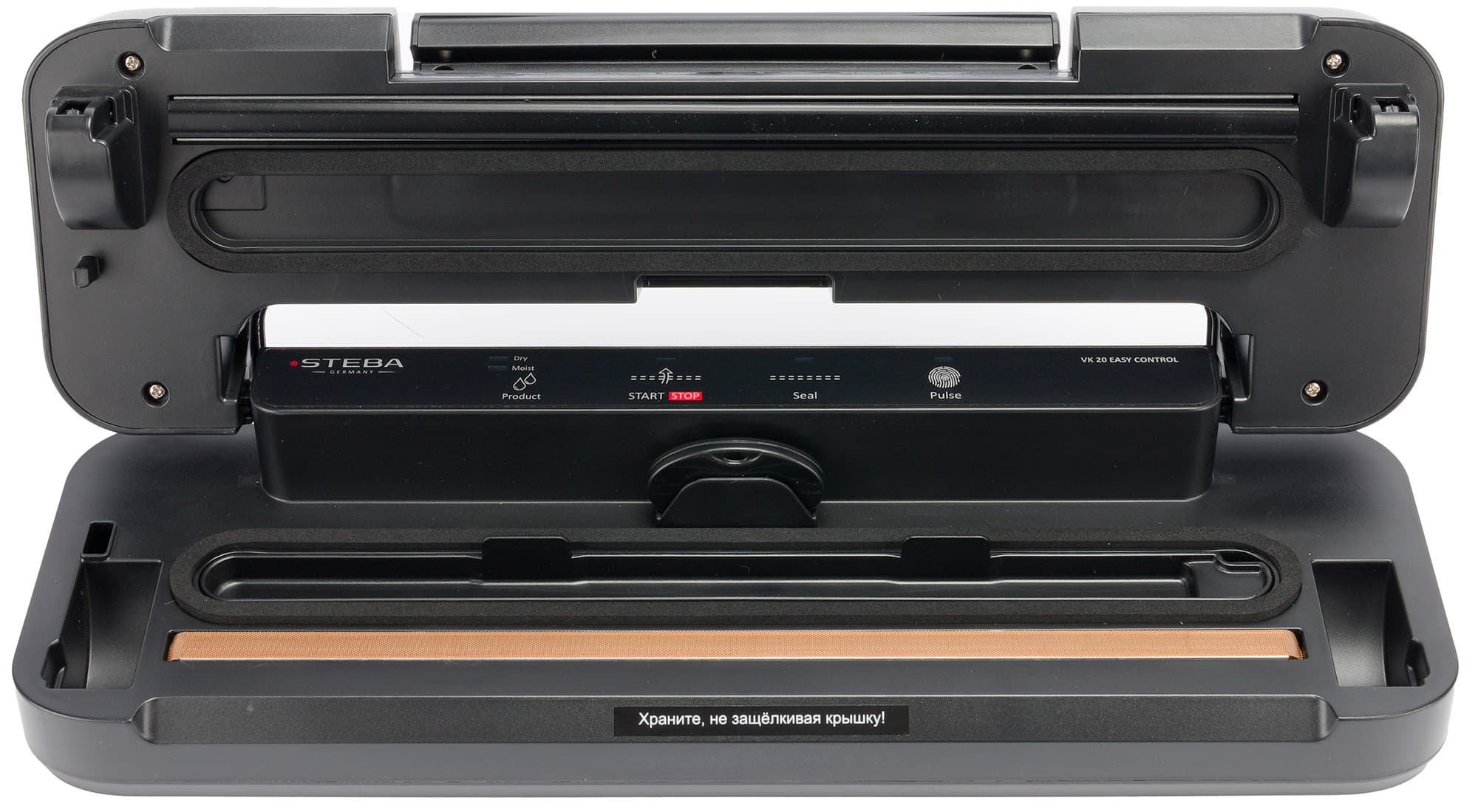 Разблокировав ручку и открыв крышку, мы видим: предупредительную наклейку о правильном способе хранения прибора, два вспененных уплотнителя снизу и сверху, нижний из которых опоясывает вакуумную камеру со съемным поддоном для сбора жидкости. Ближе к внешнему краю находится металлический нагревательный элемент с тефлоновым покрытием, а на крышке ровно над ним — прижимной валик из термостойкого материала, похожего на резину.