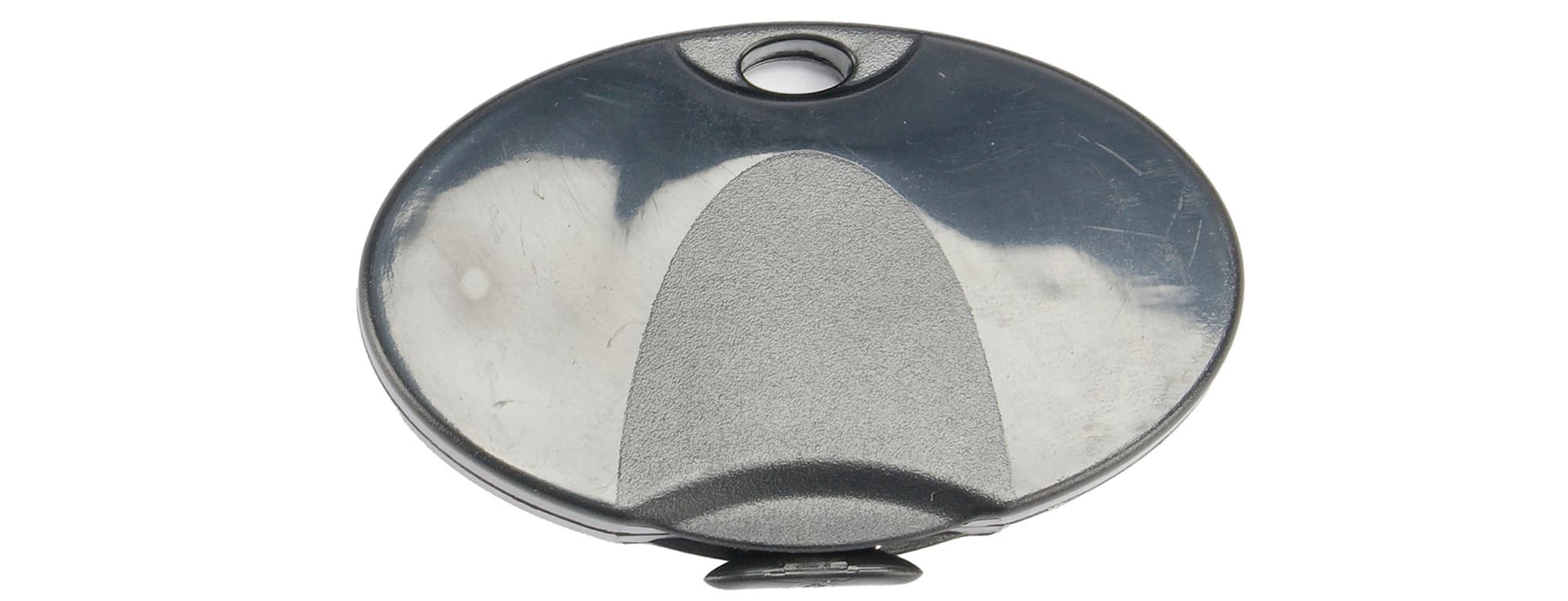 Резак представляет собой небольшой пластиковый элемент черного цвета почти овальной формы с выступом снизу — там находится лезвие, а также с отверстием сверху, в месте хвата — осмелимся предположить, предназначенным для продевания сквозь него какой-нибудь веревочки, чтобы повесить в удобном месте при частом использовании (и не терять, так как в предназначенном для него отсеке он ничем не закреплен).