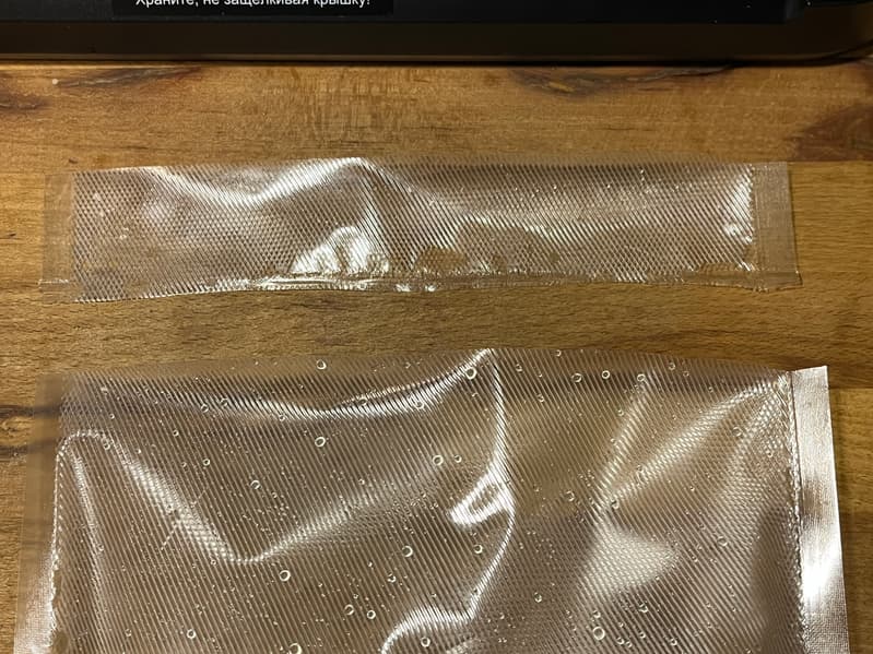 Вакуумный упаковщик вытягивал воздух из пакета в течение 13 секунд, после чего приступил к запайке в течение 10 секунд.