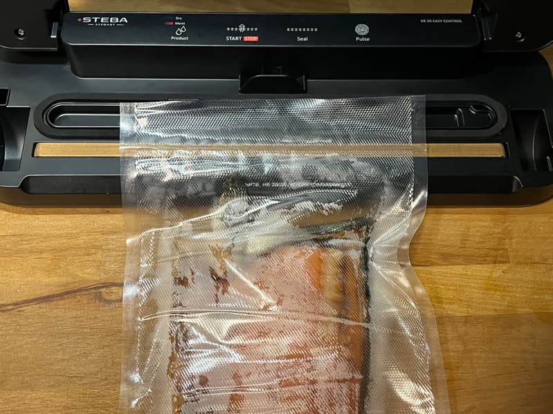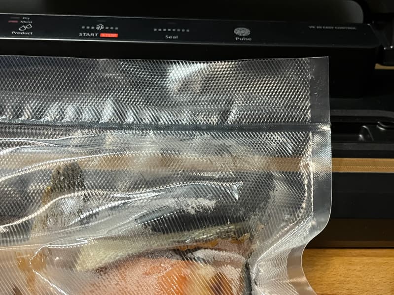 Затем заправили пакет в вакууматор и удерживали кнопку «Pulse» в течение 18 секунд, после чего прибор начал буксовать. Воздух был выкачан максимально, поэтому мы сразу же приступили к запайке.