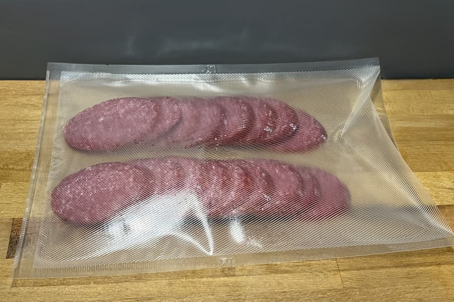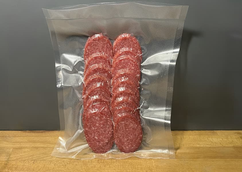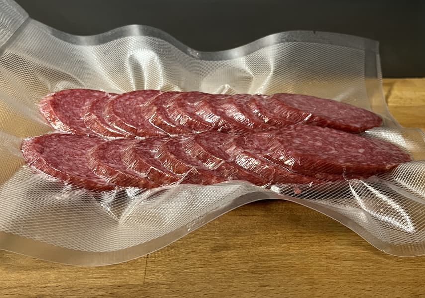 Также мы решили проверить вакууматор на сухом режиме с не совсем сухими ингредиентами. Для этой цели взяли салями.