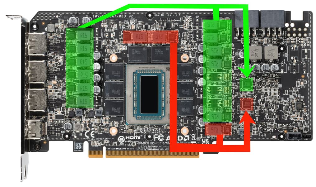 Зеленым цветом отмечена схема питания ядра (11 фаз), красным — памяти (3 фазы).