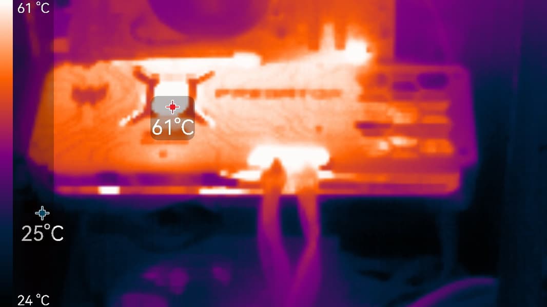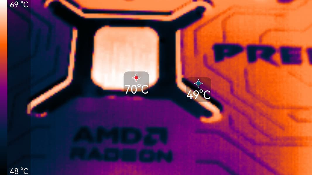 После прогона под нагрузкой максимальная температура ядра не превысила 61 градуса (hot spot — 83 °C; допускается нагрев до 110 градусов), а микросхем памяти — 90 °C, что является хорошим результатом. Энергопотребление карты доходило до 247 Вт.