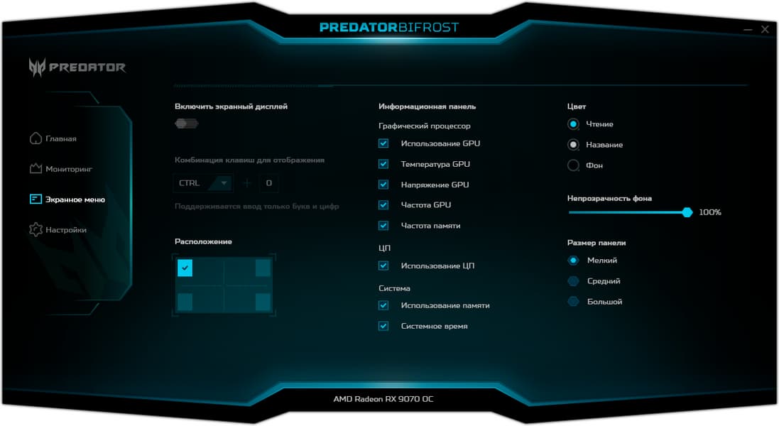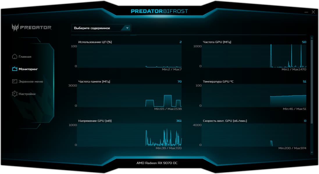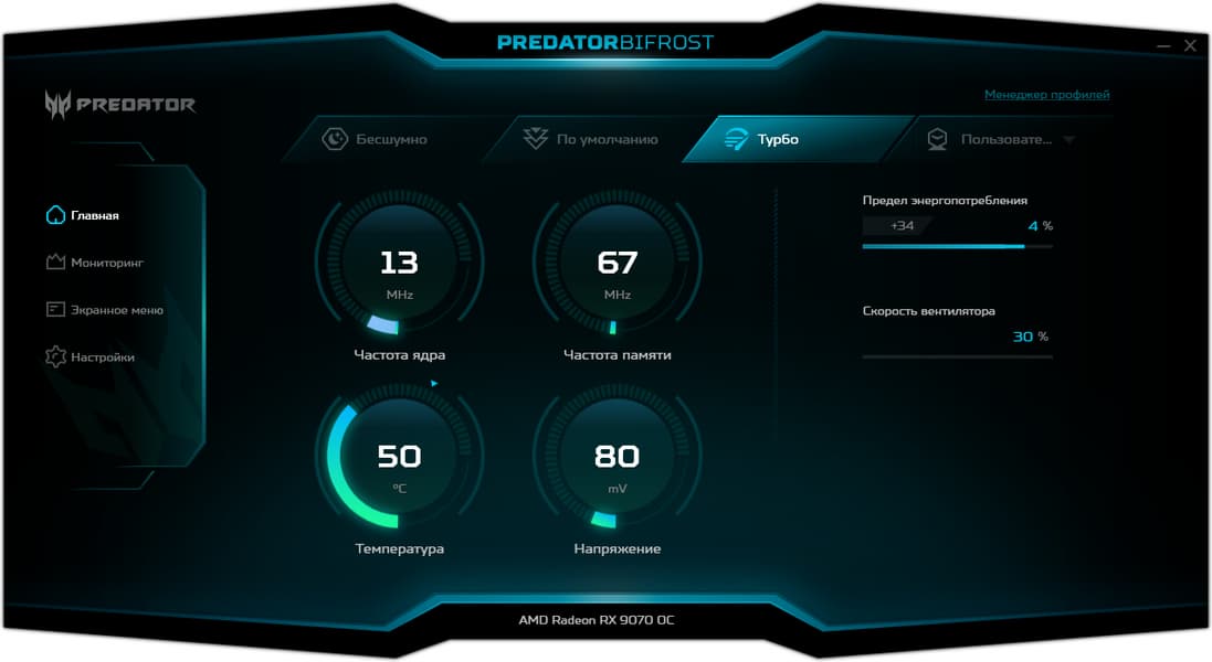 Для управления работой карт серии Predator производитель поставляет фирменную утилиту. Можно управлять вентиляторами, частотами работы и вольтажами, а также выбирать из трех заранее запрограммированных предустановок. Кроме того, программа выдает мониторинг состояния карты, а также можно настраивать работу OSD (в играх).