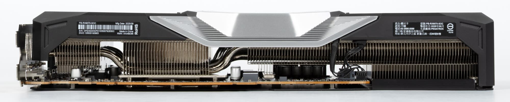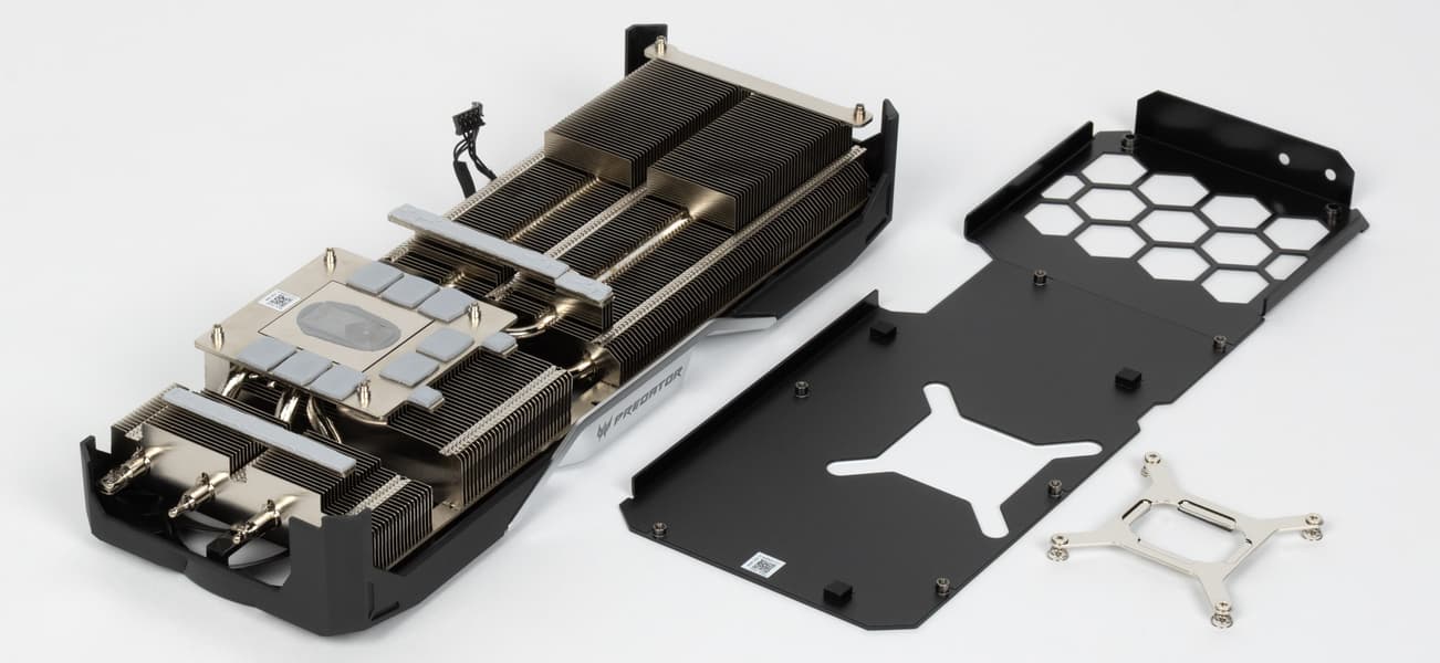 7 трубок припаяны к большой пластине, которая охлаждает ядро и микросхемы памяти. Для охлаждения преобразователей питания VRM имеются свои подошвы на радиаторе. Задняя пластина служит только элементом защиты PCB, не участвуя в охлаждении тыльной стороны PCB.