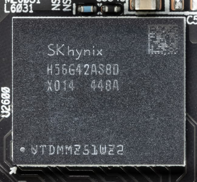 Карта имеет 16 ГБ памяти GDDR6 SDRAM, размещенной в 8 микросхемах по 16 Гбит на лицевой стороне PCB. Микросхемы памяти SK Hynix (H56G42AS8DX014) рассчитаны на номинальную частоту работы в 2500 МГц (эффективная ПСП 20 ГТ/с, или 20 Гбит/с).