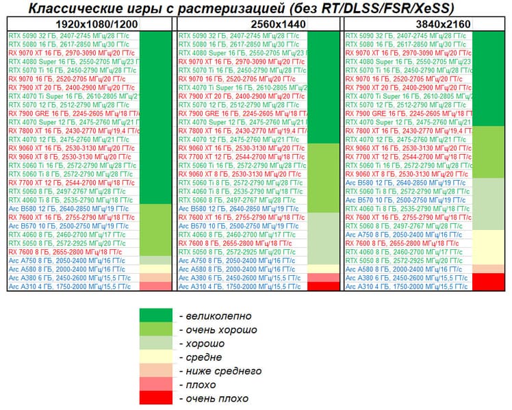 | 05 | Acer Predator RX 9070, 2700—3153 МГц/20 ГТ/с | 2504 | 358 | 70 000 |