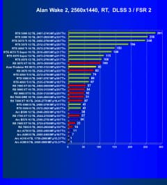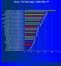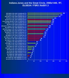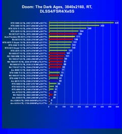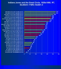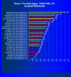 Рейтинг составлен по 10 тестам, в которых используется технология трассировки лучей и одновременно технология Nvidia DLSS, AMD FSR или Intel XeSS. Этот рейтинг нормирован по самому слабому ускорителю в данной группе — Arc A310 (то есть сочетание скорости и функций Arc A310 приняты за 100%).